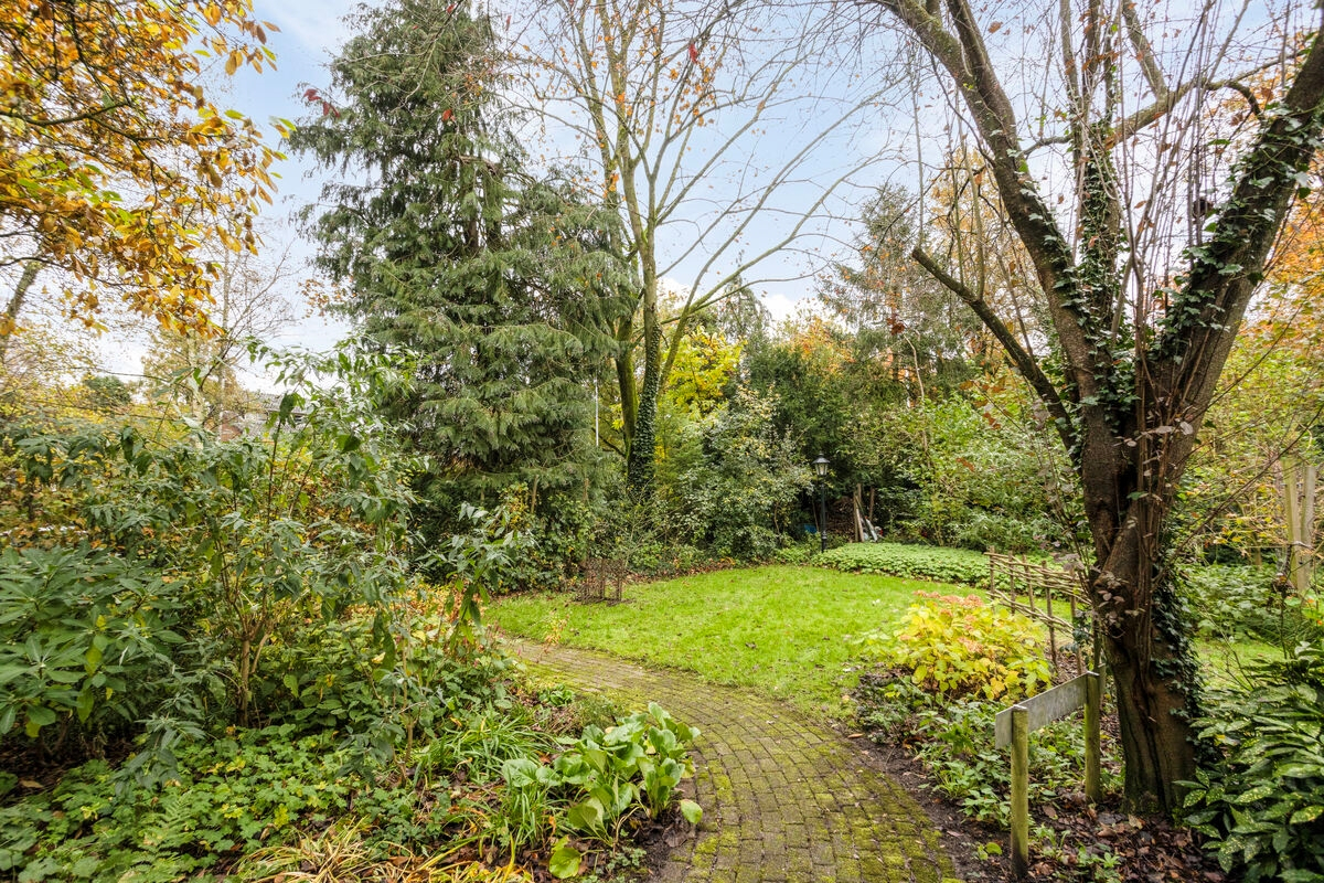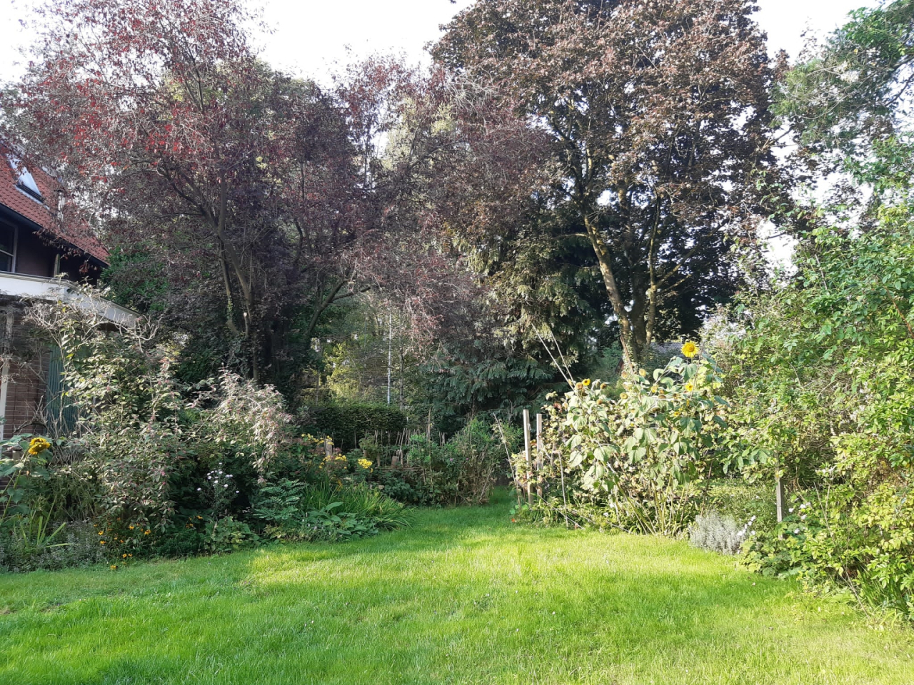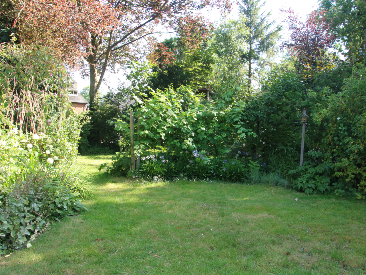 Ruime groene tuin met gazon, diverse plantenperken, markante bomen, struiken en een fijn terras. De tuin bevindt zich grotendeels aan de zijkant van de woning en is op het oosten gelegen.