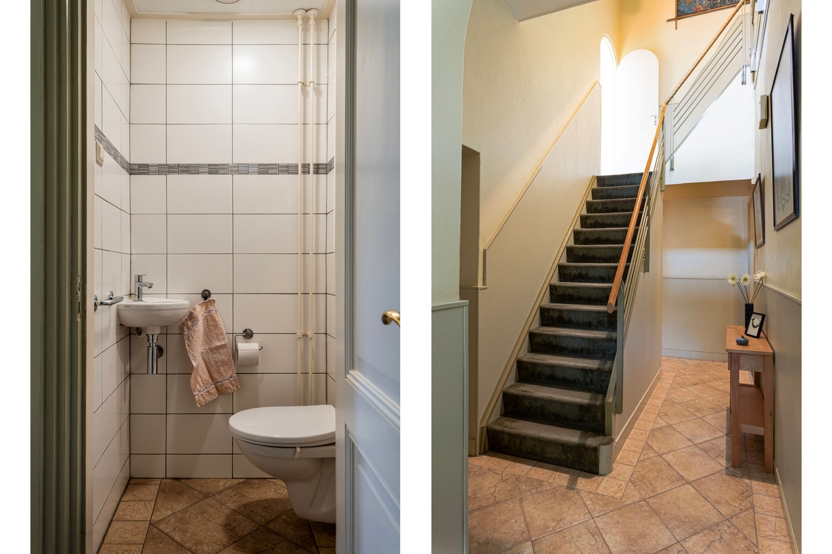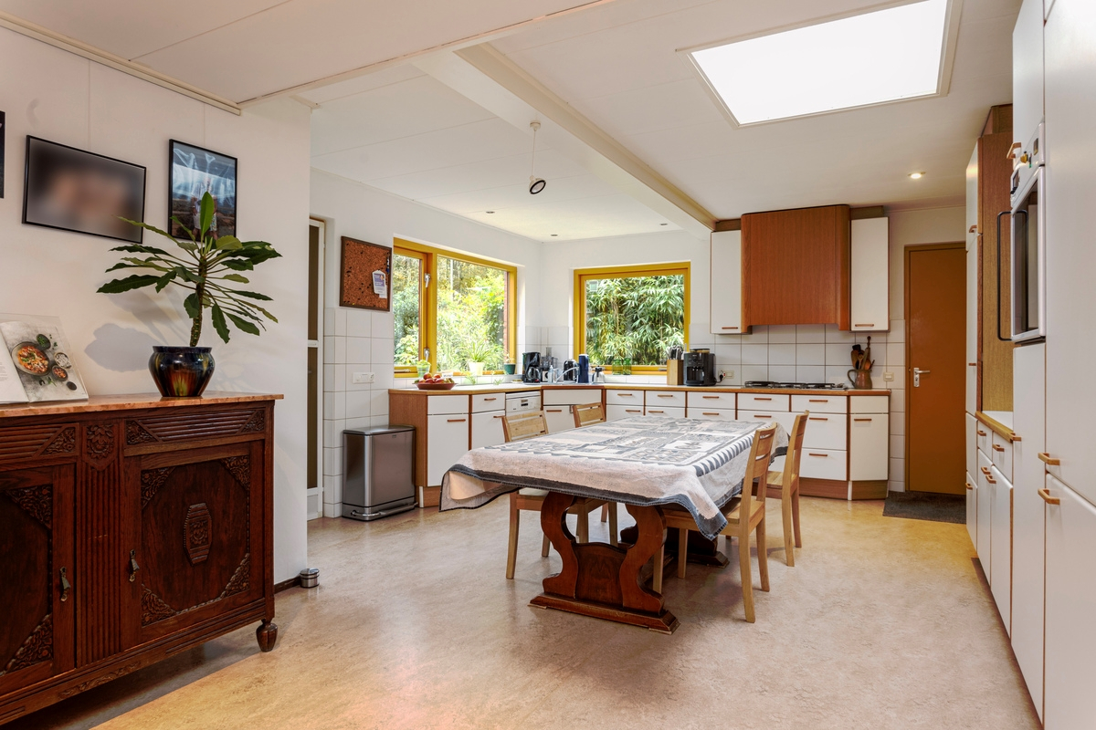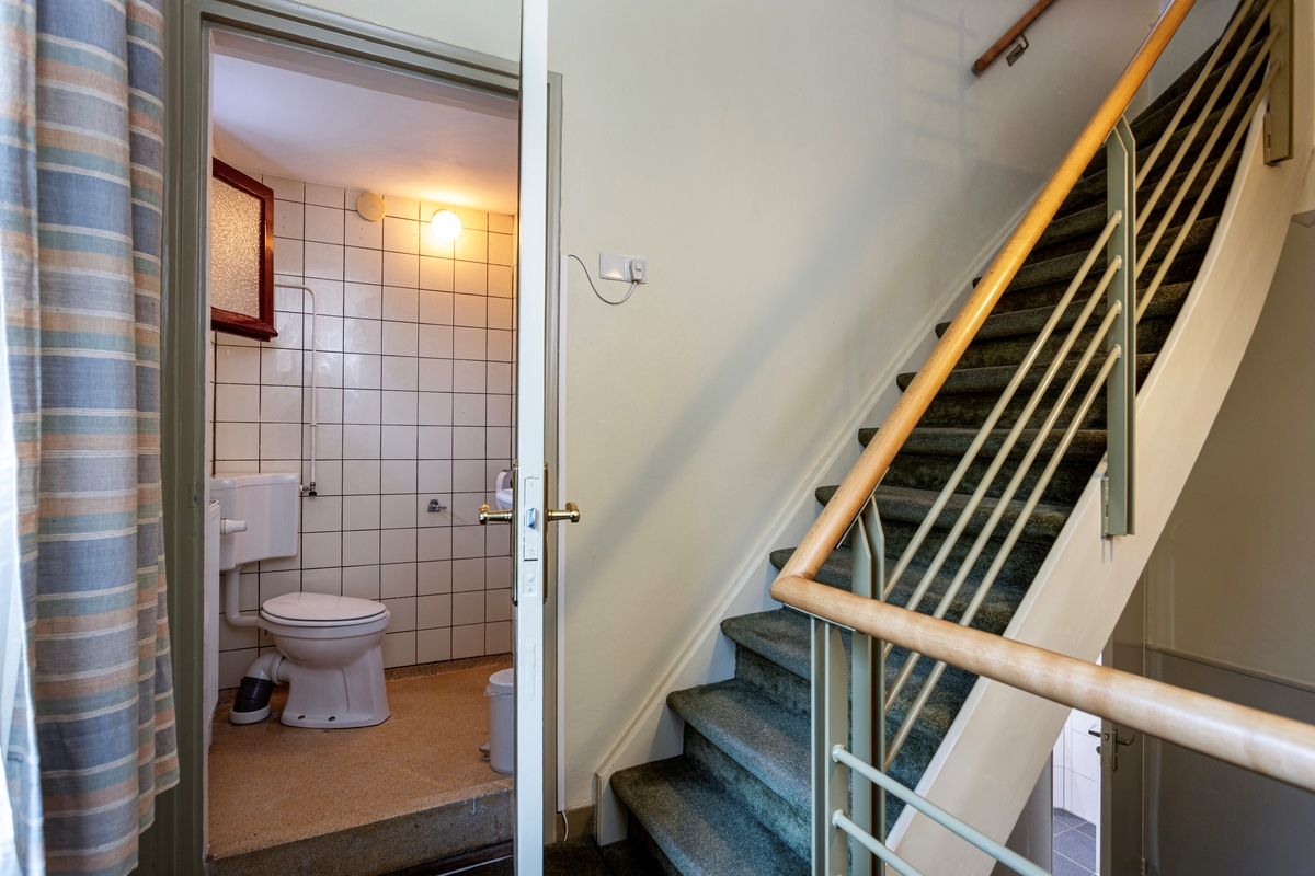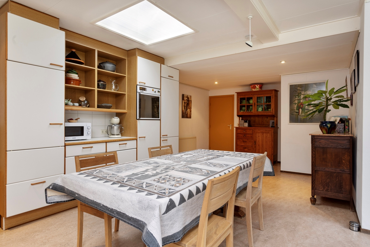 Sfeervolle entree met overkapping, gang met tegelvloer, meterkast (2020) en toilet met fonteintje. Vanuit de gang krijgt u toegang tot de kelder op stahoogte (+/- 12 m²), de woonkamer, de woonkeuken en het kantoor. De woonkamer met eethoek is ruim (+/- 40 m²) en lekker licht dankzij de grote raampartijen. Verder is de woonkamer voorzien van mozaïek parketvloer, een gezellige houtkachel en een deur naar de tuin. De eveneens ruime eetkeuken is voorzien van een wasbak, een 5 pits gaskookplaat, afzuigkap, oven, koelkast met vriesvak, vaatwasser en een elektrische boiler (10 liter/2018). Hier past een grote eettafel om gezellig met familie of vrienden te genieten van een goede maaltijd en fijne gesprekken. Vanuit de eetkeuken is zowel de tuin met terras als de berging bereikbaar. Voor mensen die thuis werken of een praktijkruimte nodig hebben is dit ook de perfecte woning. De praktijkruimte is v.v. een vaste kast en heeft uitzicht op de tuin en is direct via de gang te bereiken, maar heeft ook een eigen ingang vanuit de tuin.