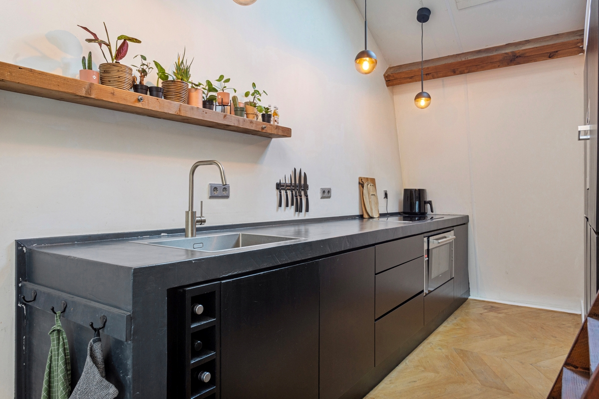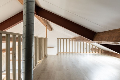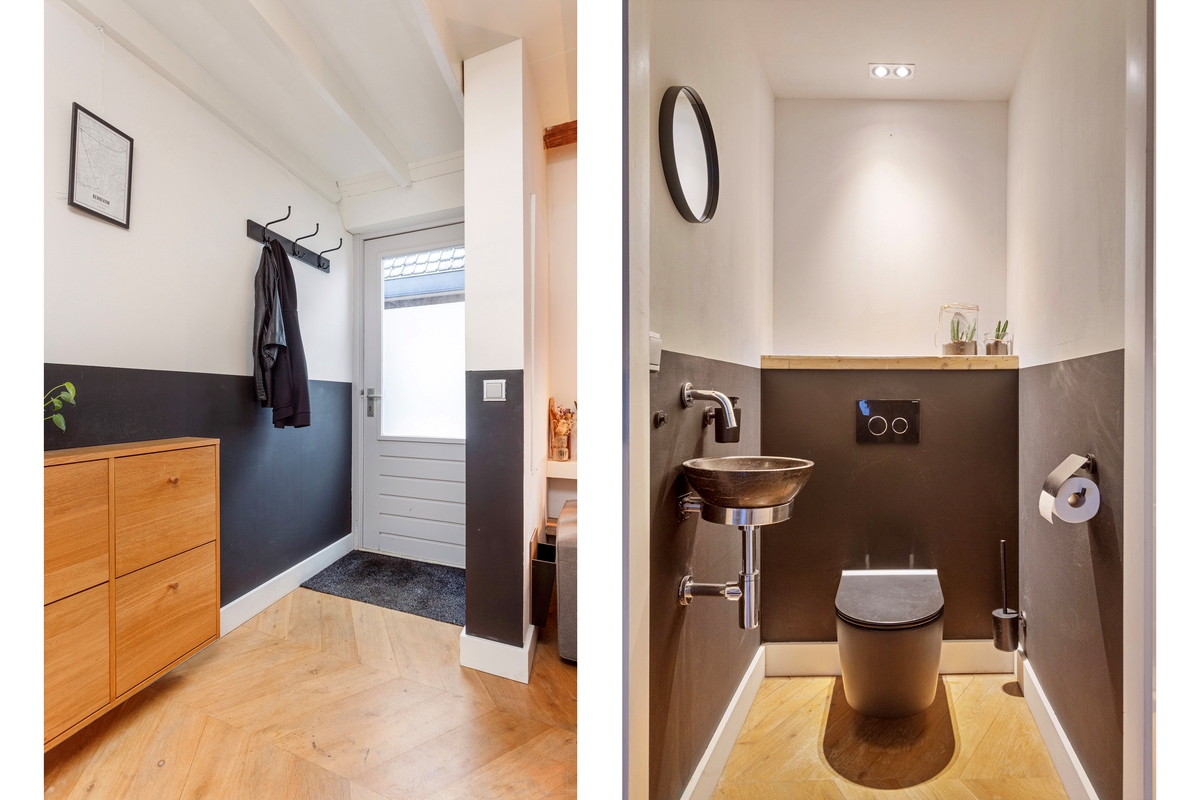 Via de entree kom je binnen in de hal met toegang tot een modern toilet en fonteintje. De royale woonkamer is verrassend licht dankzij meerdere Velux dakramen en heeft een fraaie massief eiken visgraatvloer. De hoge plafonds geven het geheel karakter en een ruimtelijk gevoel.
