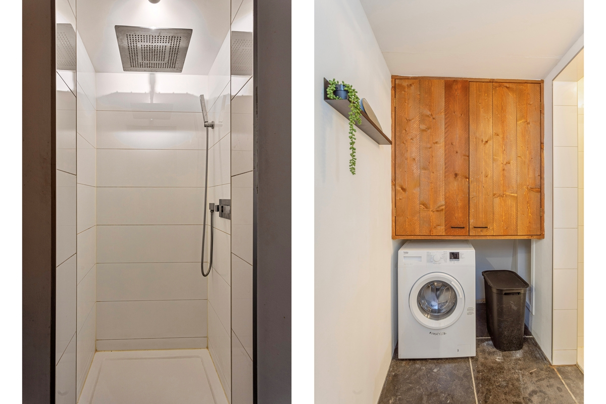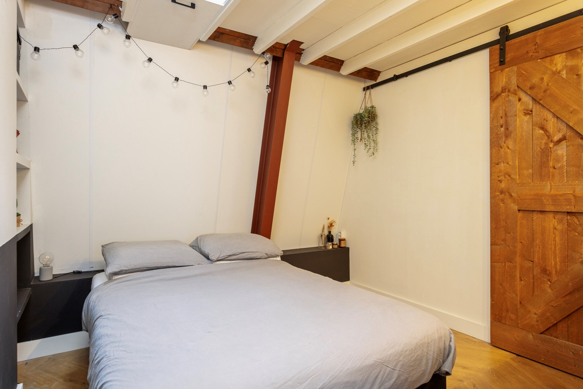 Centraal in de woning bevindt zich de slaapkamer, met directe toegang tot de badkamer. Deze is voorzien van een inloopdouche en wasmachineaansluiting. De wastafel bevindt zich in de slaapkamer. Boven de slaapkamer en badkamer bevindt zich een mooie vide, bereikbaar via een vaste trap naast de keuken, een ideale plek voor extra bergruimte of als logeerkamer.
