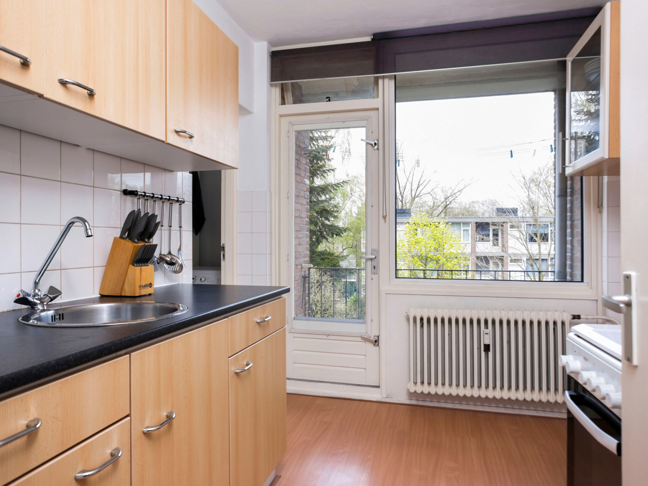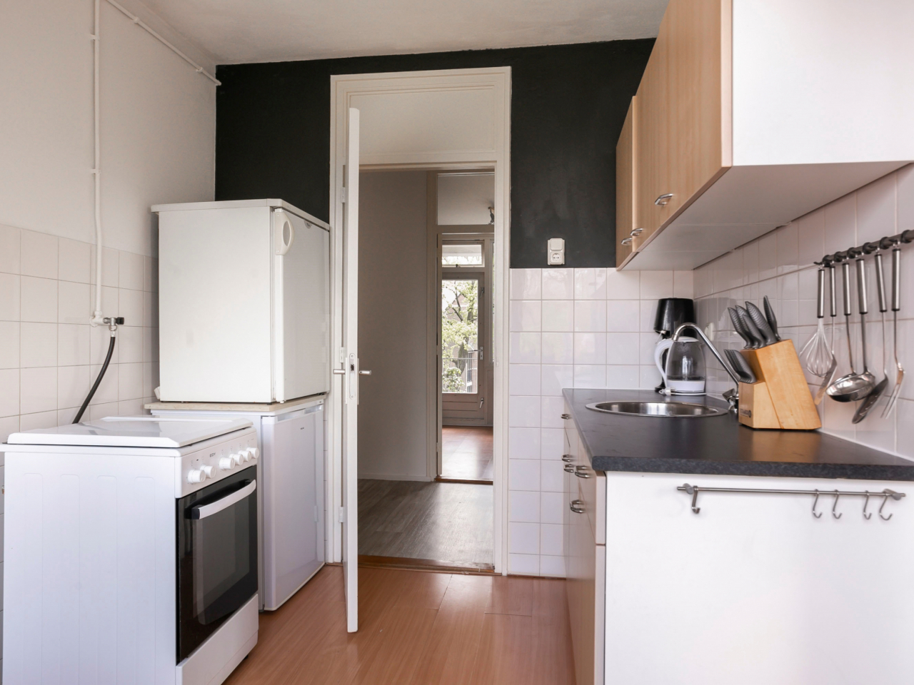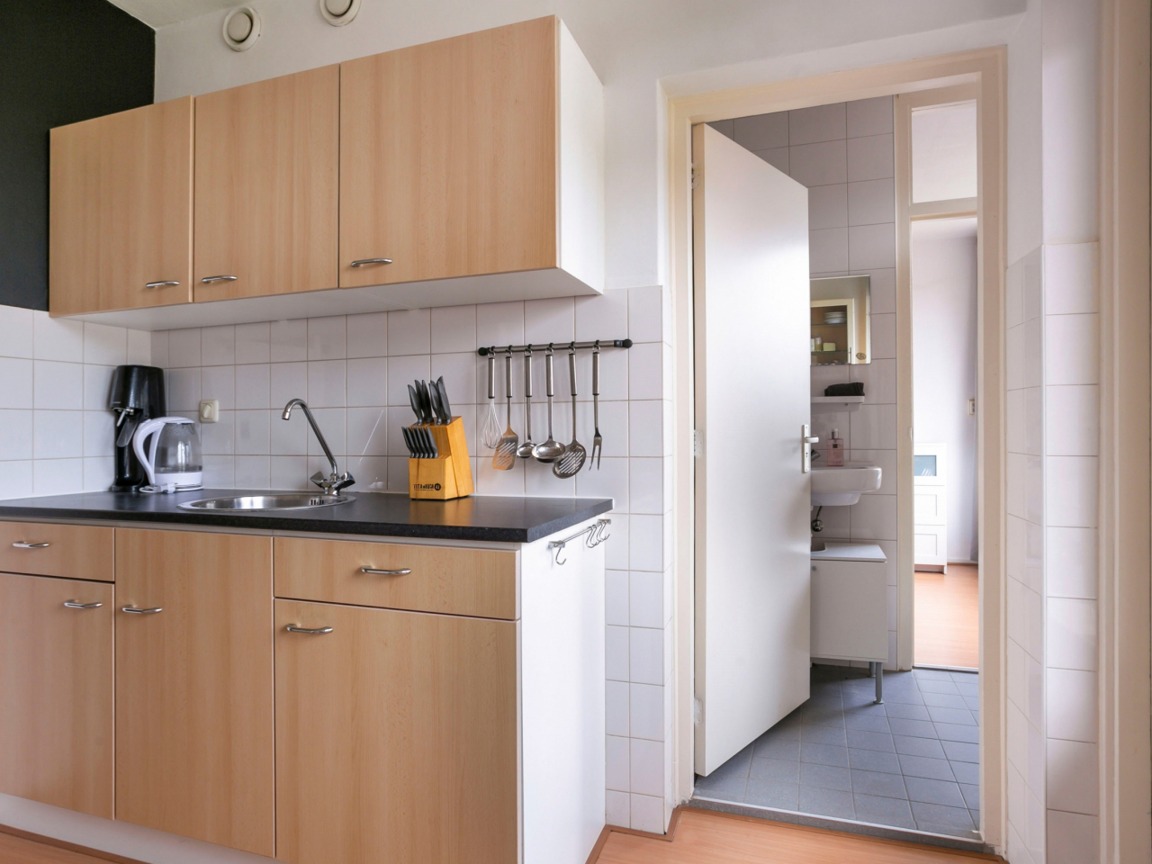 De dichte keuken is voorzien van een keukenblok met spoelbak en voldoende opbergkasten. Vanuit de keuken heeft u toegang tot het eerste balkon dat op het westen gelegen is en met vrij uitzicht op een grasveld met plantenperken en onder ander prachtige bloesembomen.