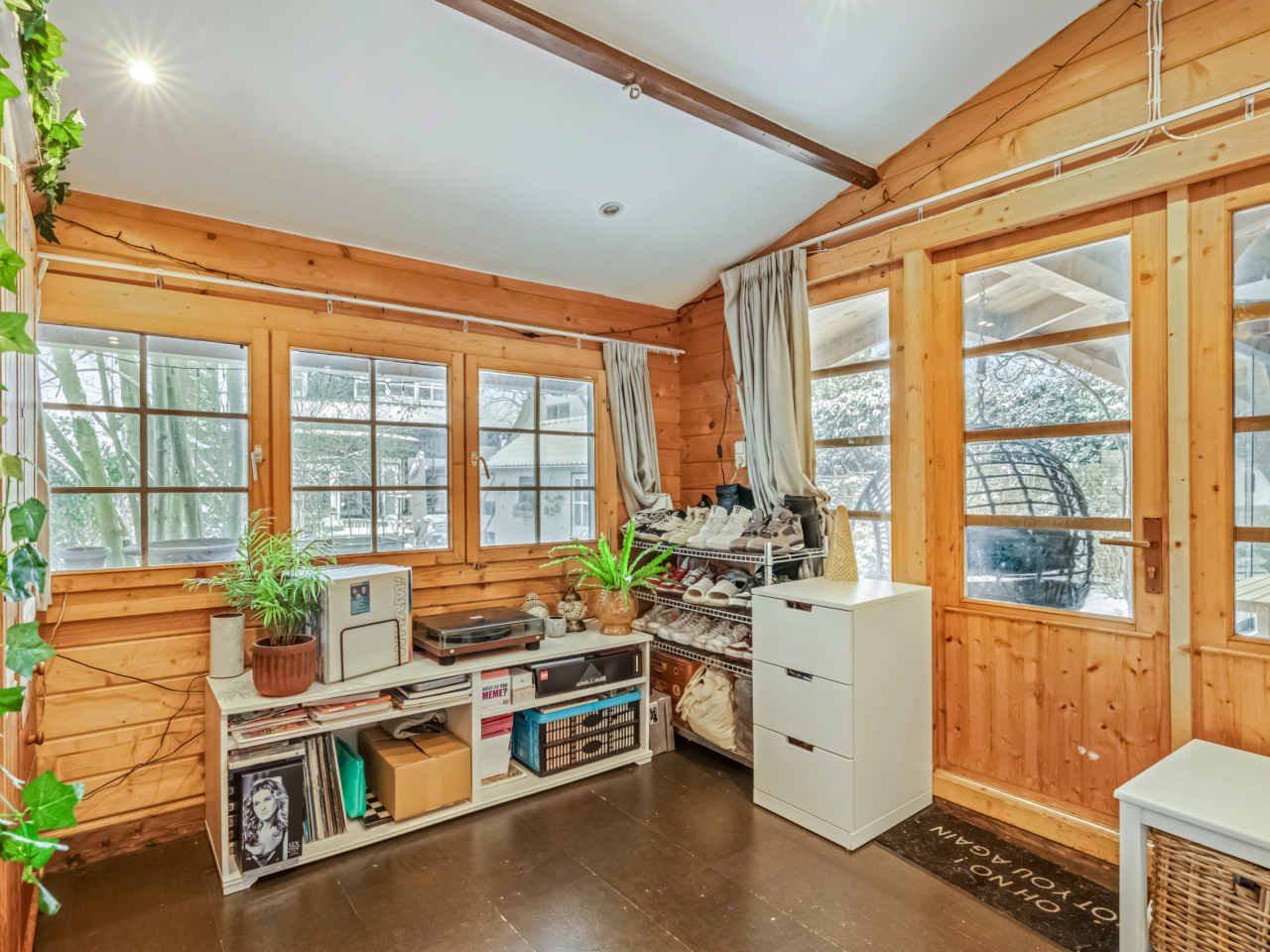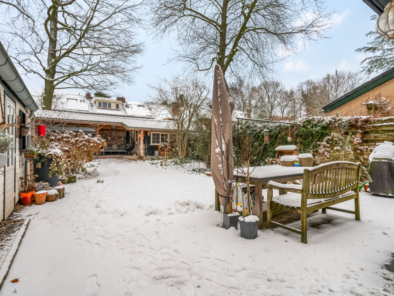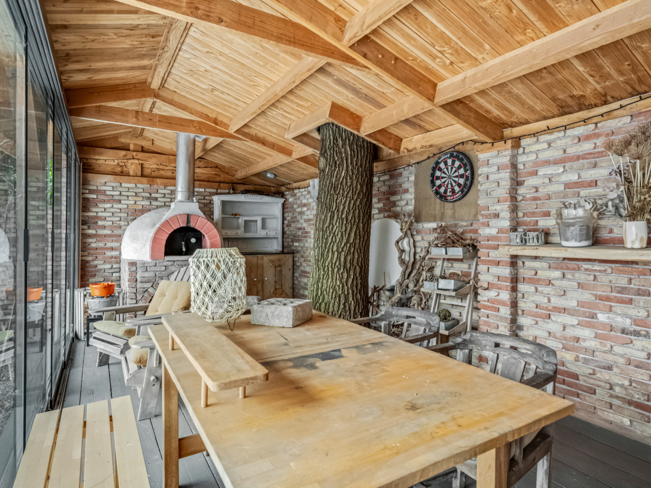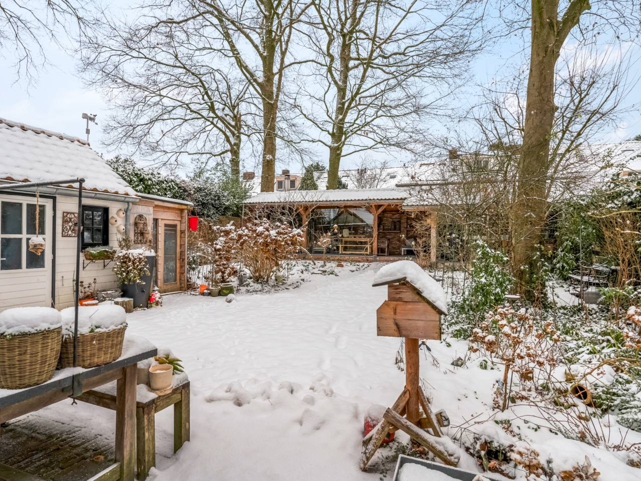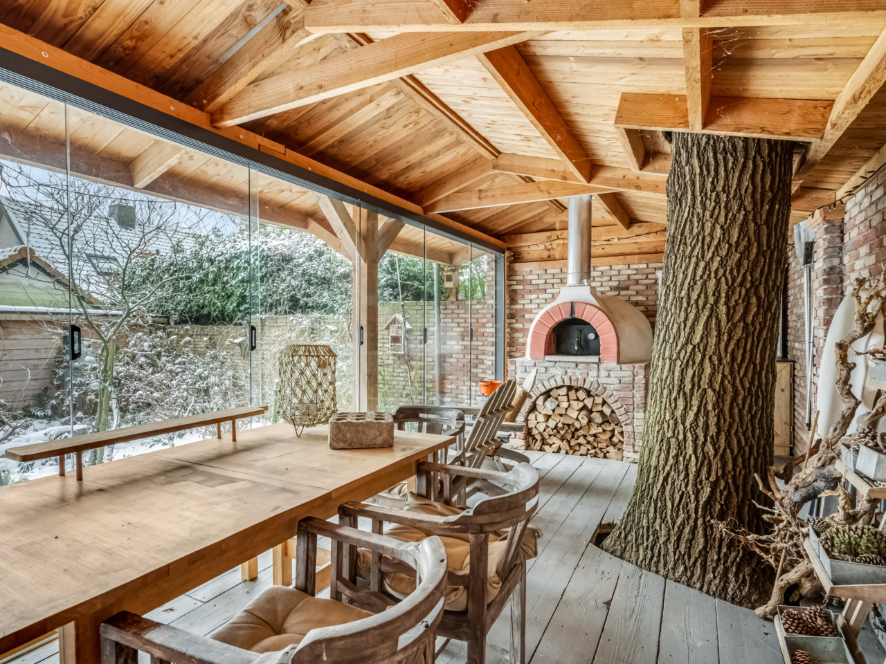 Rondom de woning ligt een prachtige groene bostuin met diverse borders, bomen, struiken en gazon. Achterin de tuin bevindt zich een zeer royale afsluitbare veranda met aangebouwd tuinhuis. De veranda is voorzien van een pizza-oven.