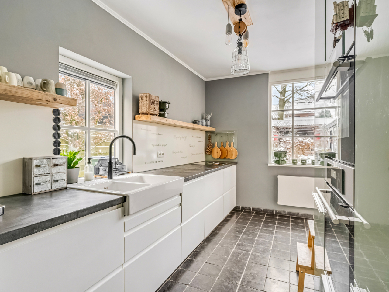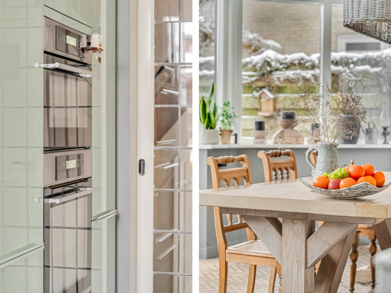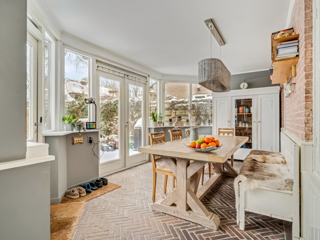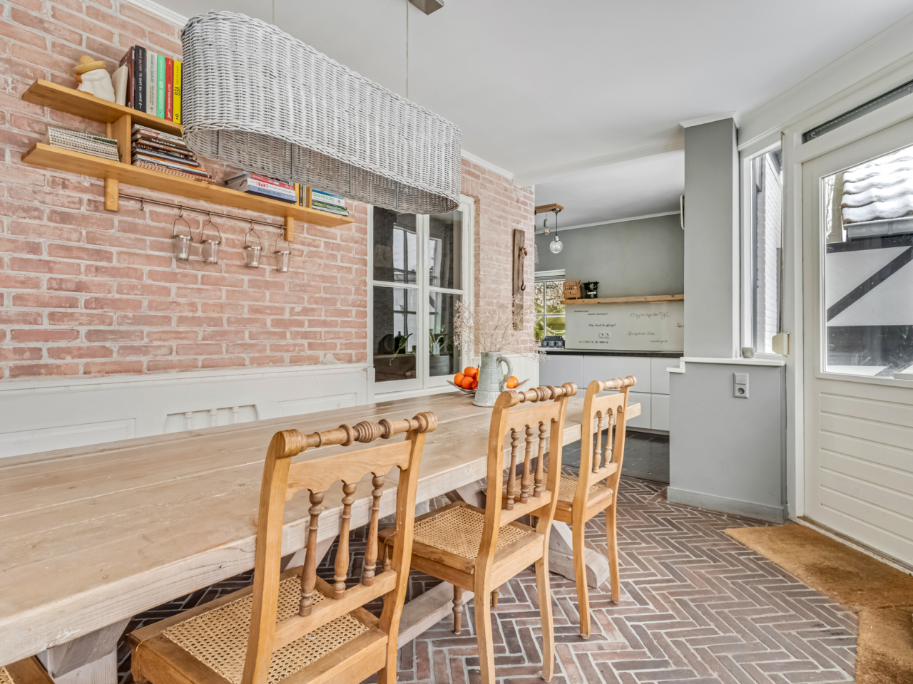 De eetkamer in de uitbouw grenst aan de keuken en is voorzien van een klinkervloer in visgraat patroon. Hier past een grote eettafel en deze ruimte grenst direct aan de achtertuin. De keuken is modern en voorzien van diverse inbouwapparatuur zoals een inductiekookplaat met afzuiging, oven (2026), magnetron, Quooker (2025), vaatwasser en koel/vriescombinatie. Deze ruimte is v.v. vloerverwarming.