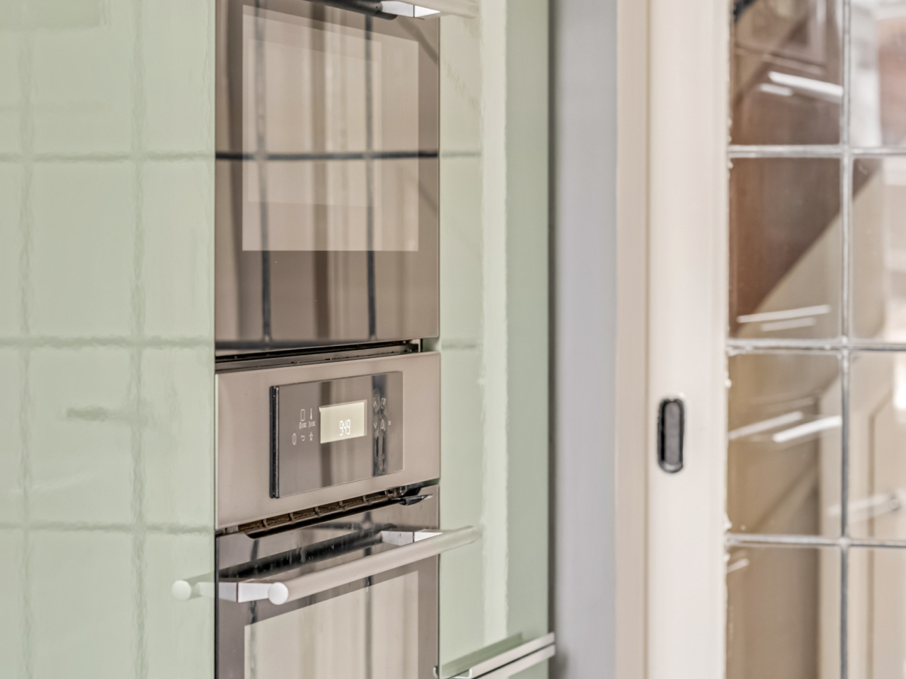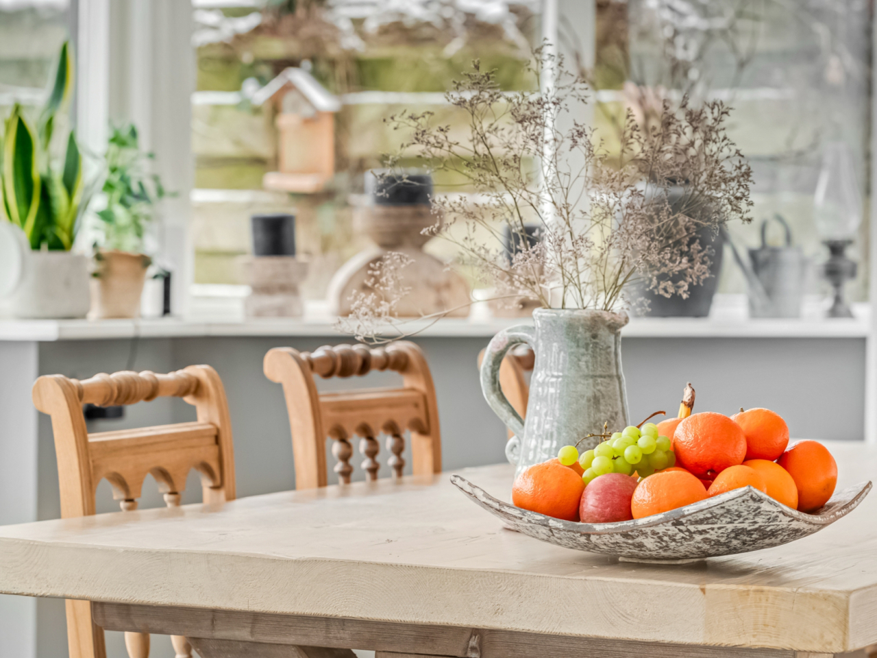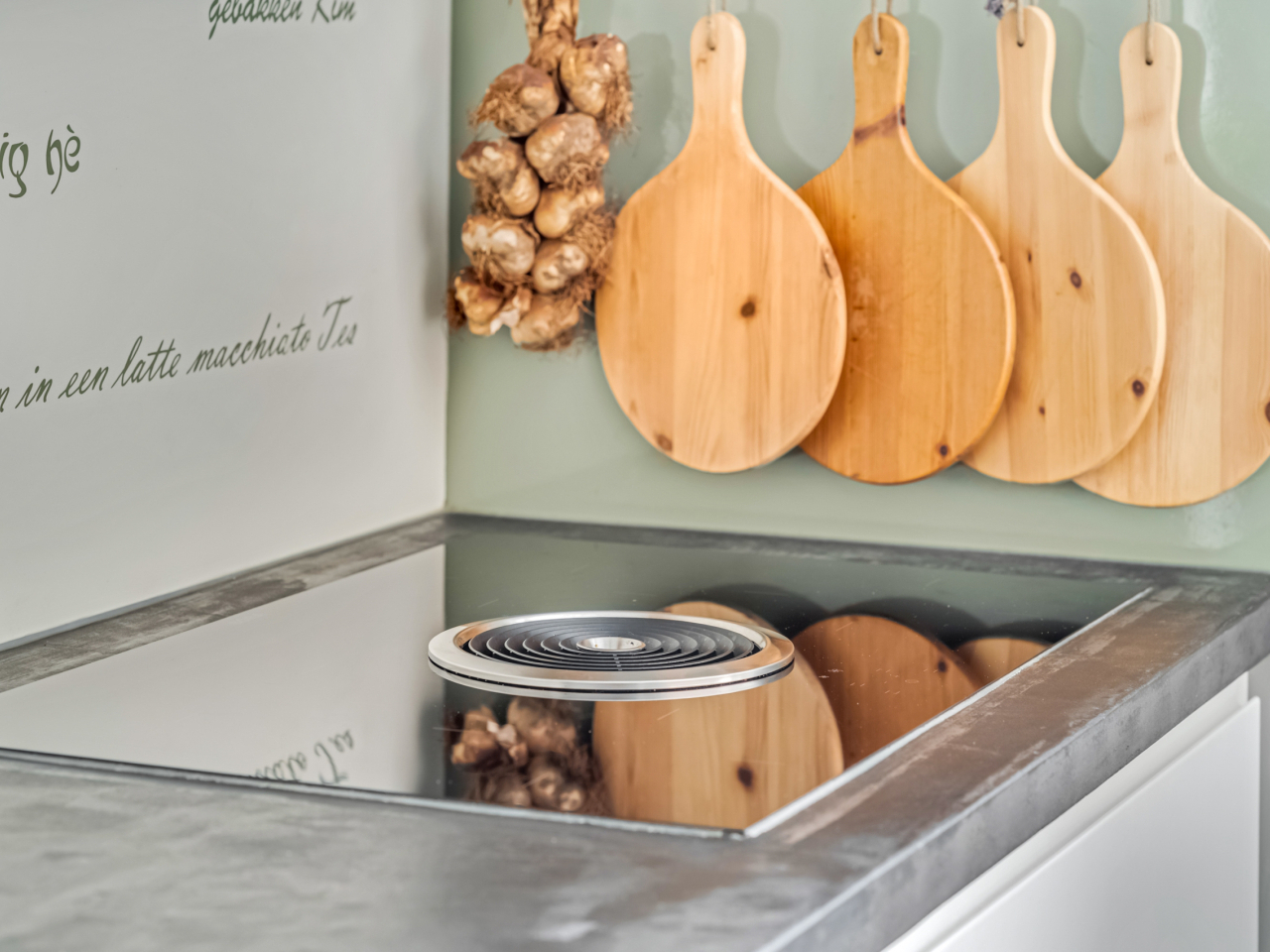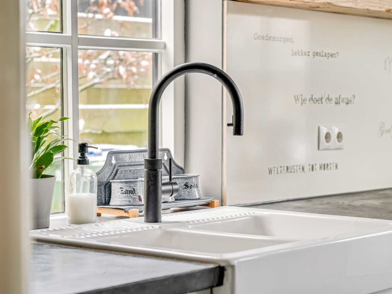 De eetkamer in de uitbouw grenst aan de keuken en is voorzien van een klinkervloer in visgraat patroon. Hier past een grote eettafel en deze ruimte grenst direct aan de achtertuin. De keuken is modern en voorzien van diverse inbouwapparatuur zoals een inductiekookplaat met afzuiging, oven (2026), magnetron, Quooker (2025), vaatwasser en koel/vriescombinatie. Deze ruimte is v.v. vloerverwarming.