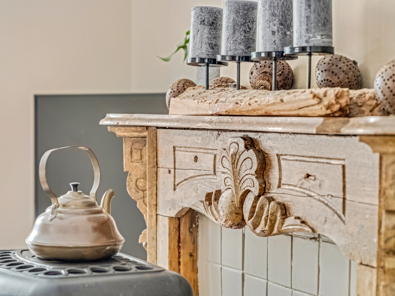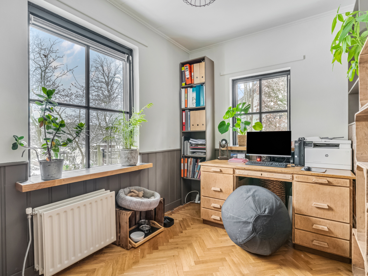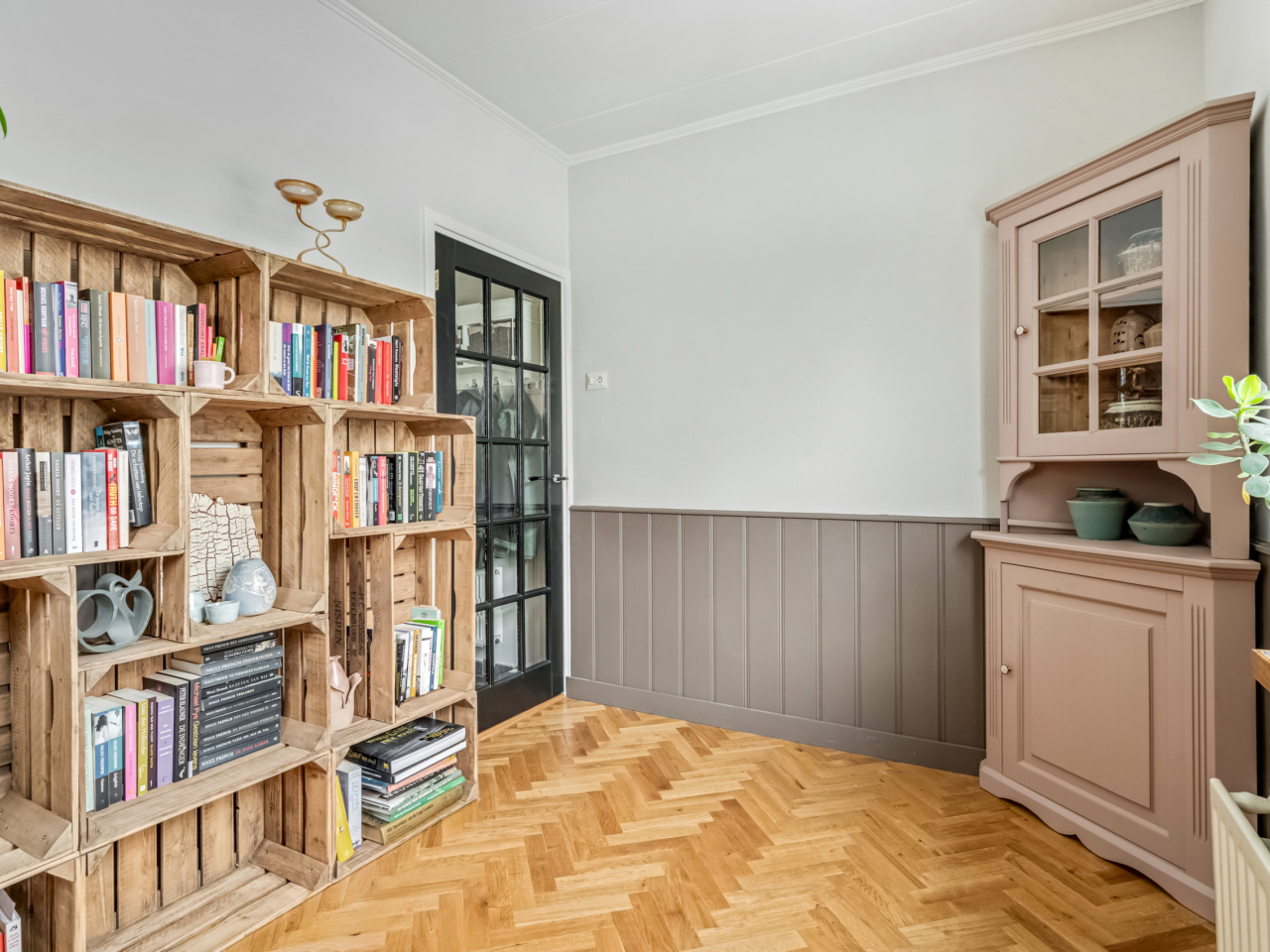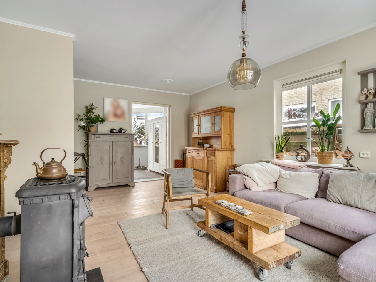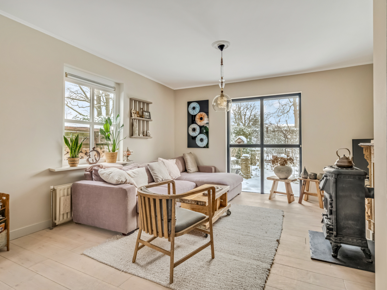 De sfeervolle woonkamer is voorzien van een mooie houten vloer en een gezellige houtkachel met daarachter een houten schouw. Door de grote raampartij tot aan de vloer aan de voorzijde is het hier heerlijk licht. De werkkamer ligt eveneens aan de voorzijde van de woning en is ook voorzien van een houten vloer.