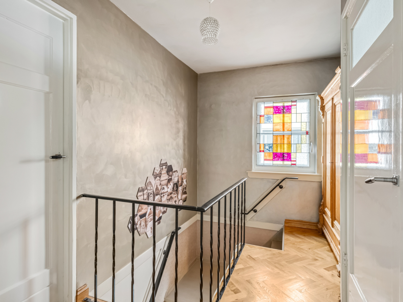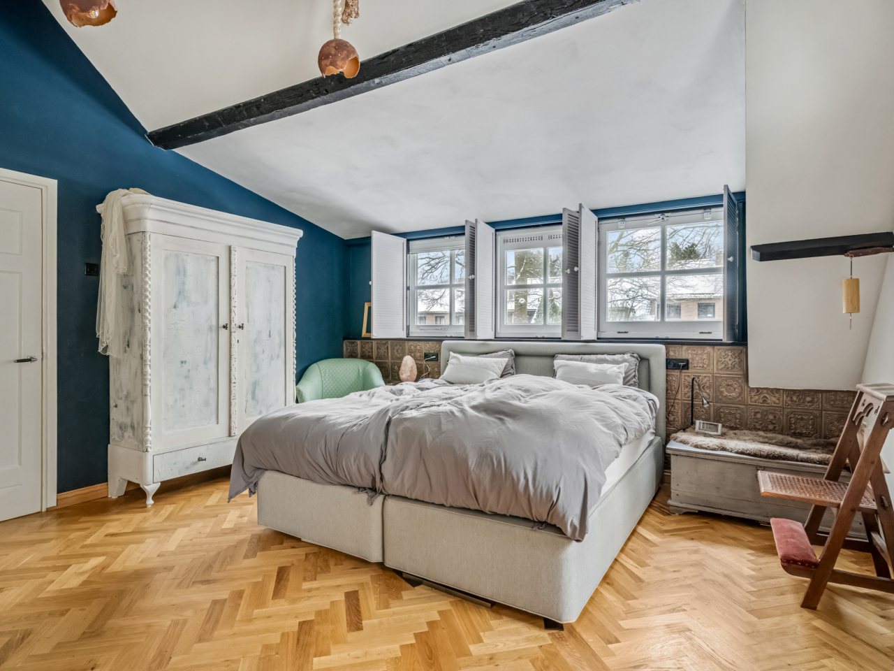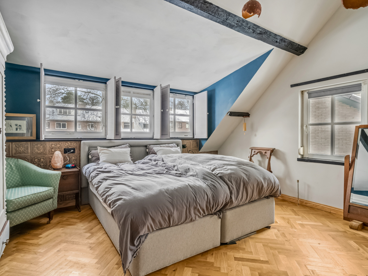 De overloop biedt toegang tot twee slaapkamers, waarvan één hele ruime kamer (die eventueel kan worden opgesplitst in 2 kamers). Deze master bedroom heeft sfeervolle roede raampjes met luiken aan de binnenzijde en een hoog balkenplafond voor een ruimtelijk effect.