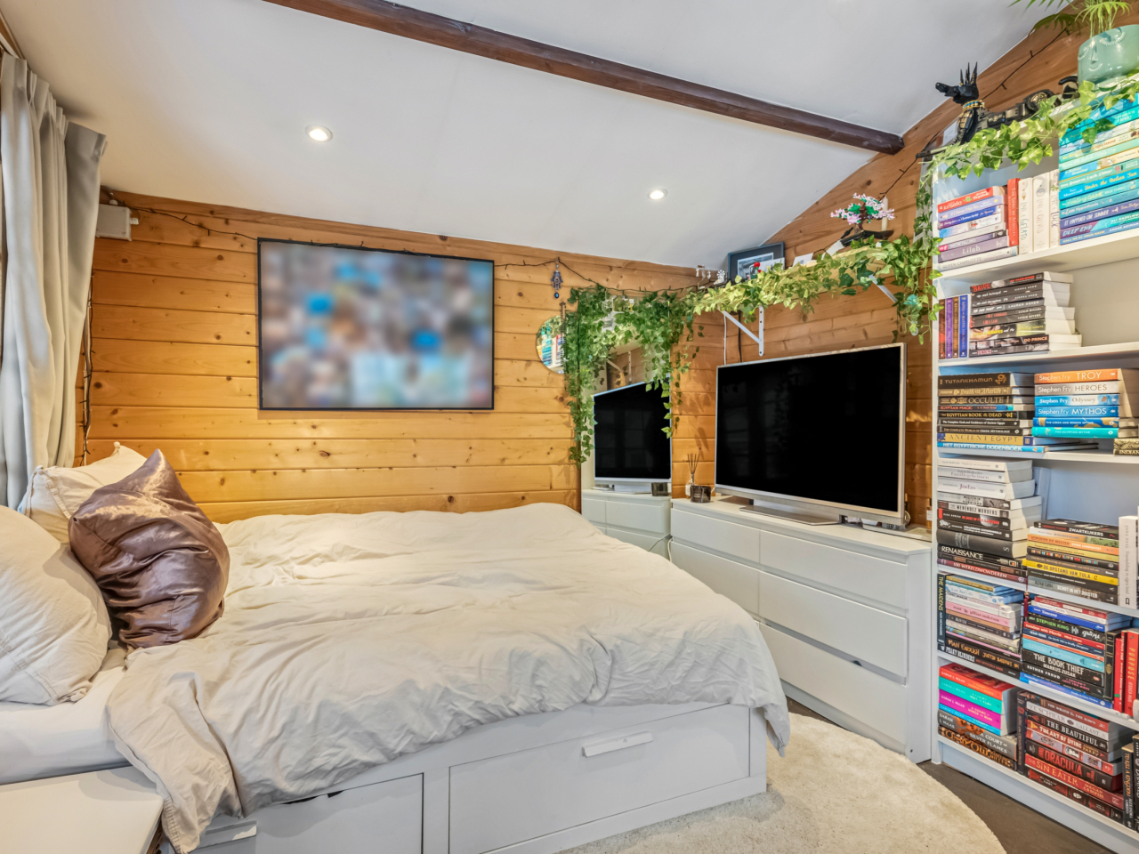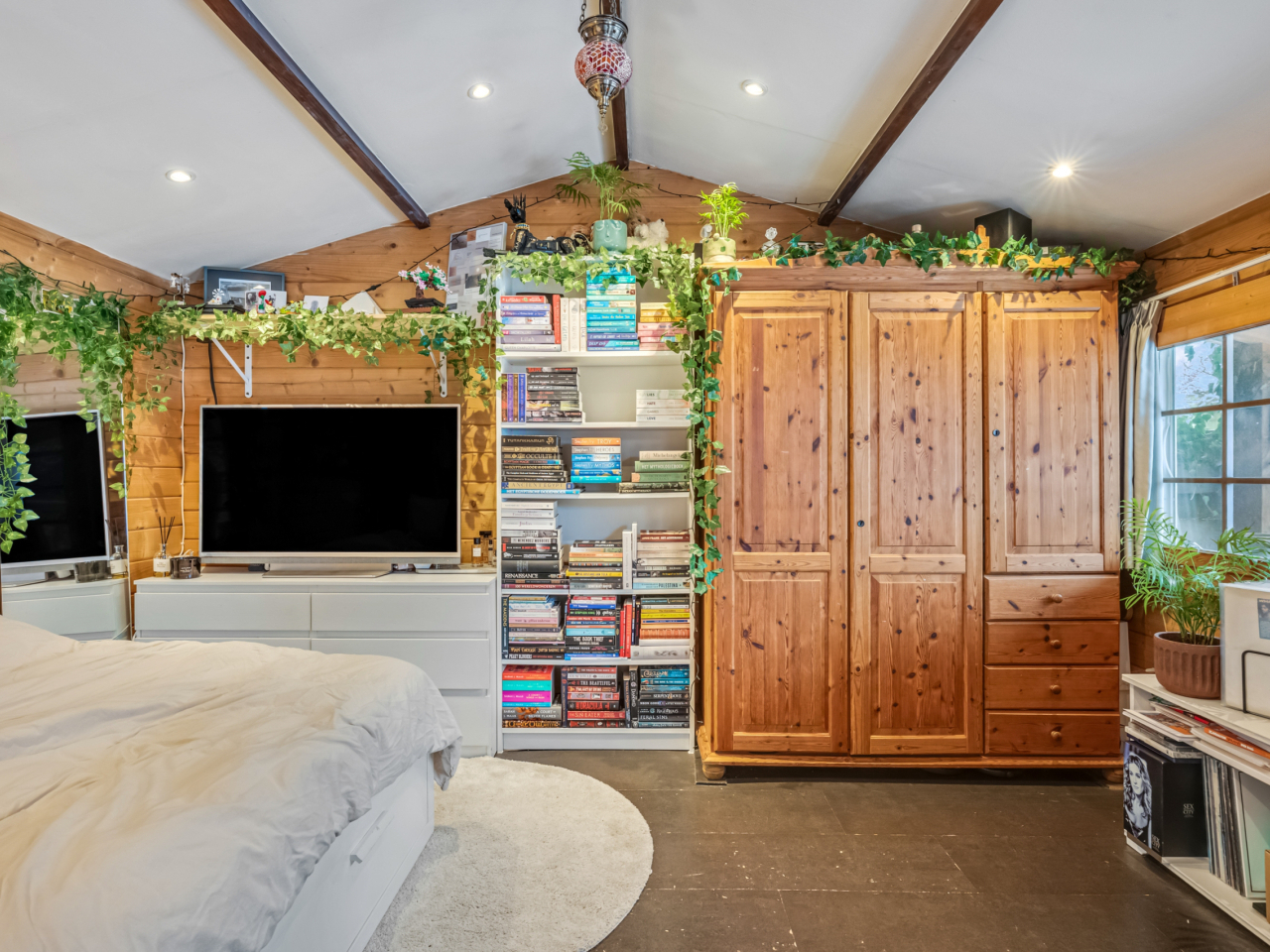 In het tuinhuis is een extra slaap/logeerkamer gerealiseerd die met een losse kachel verwarmd kan worden.