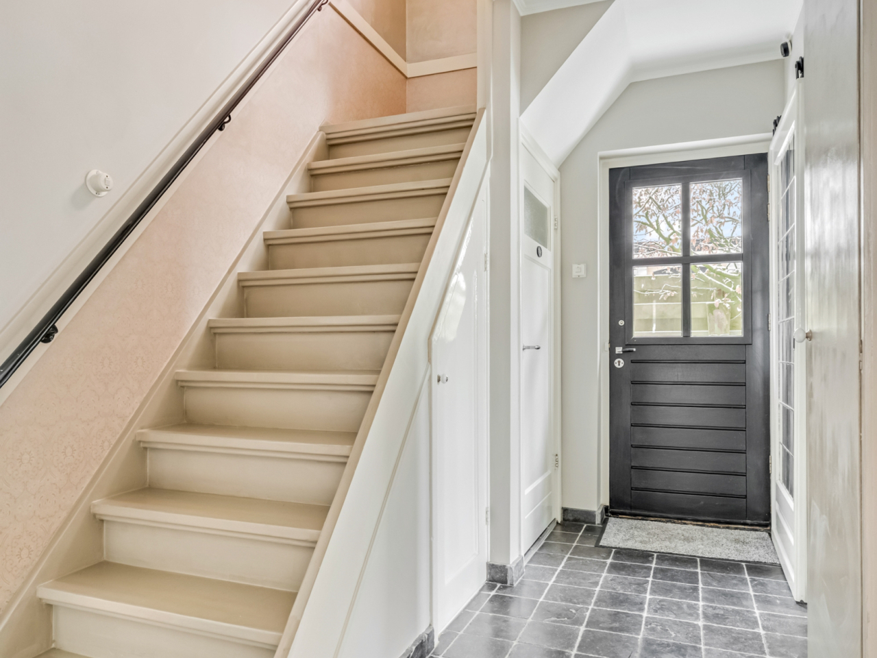 Via de middels een hek afsluitbare oprit komen we bij de voordeur. De hal met fraaie tegelvloer van Chinees hardsteen biedt toegang tot alle ruimtes en de trapopgang. Tevens bevinden zich hier de meterkast en een trapkast.