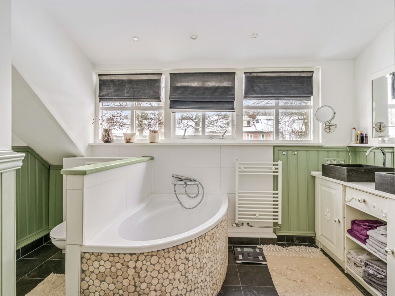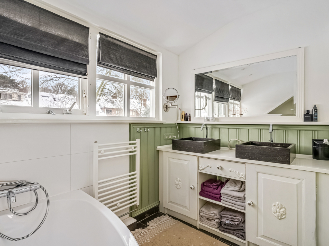 De badkamer is compleet uitgevoerd en voorzien van een dubbel wastafelmeubel, een inloopdouche, ligbad, handdoekradiator, tweede toilet en vloerverwarming.