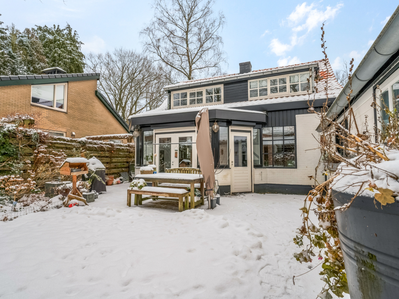 De woning beschikt over een sfeervolle woonkamer, een werkkamer op de begane grond en een ruime leefkeuken in de uitbouw. Rondom de woning ligt een fraaie groene tuin met meerdere terrassen, een houten veranda met slaap/werkkamer en parkeergelegenheid op eigen terrein.