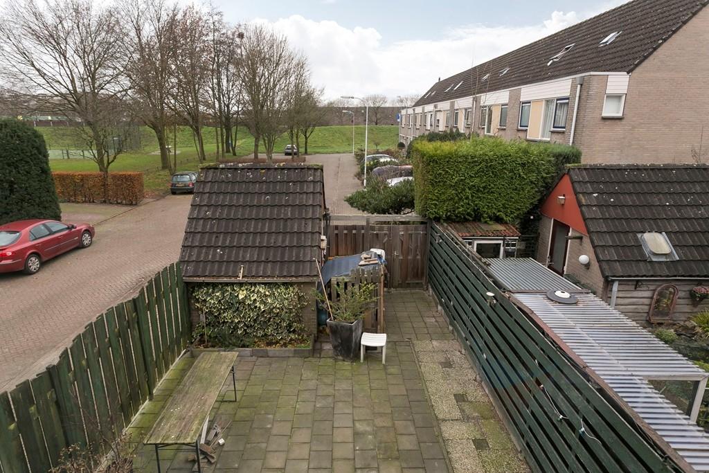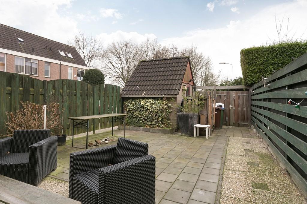 De achtertuin is heerlijk zonnig gelegen op het westen en is voorzien van een ruime stenen berging met bergzolder.