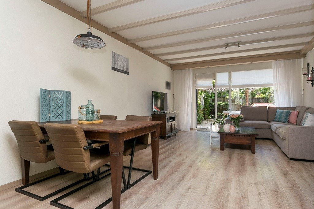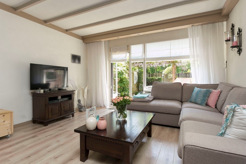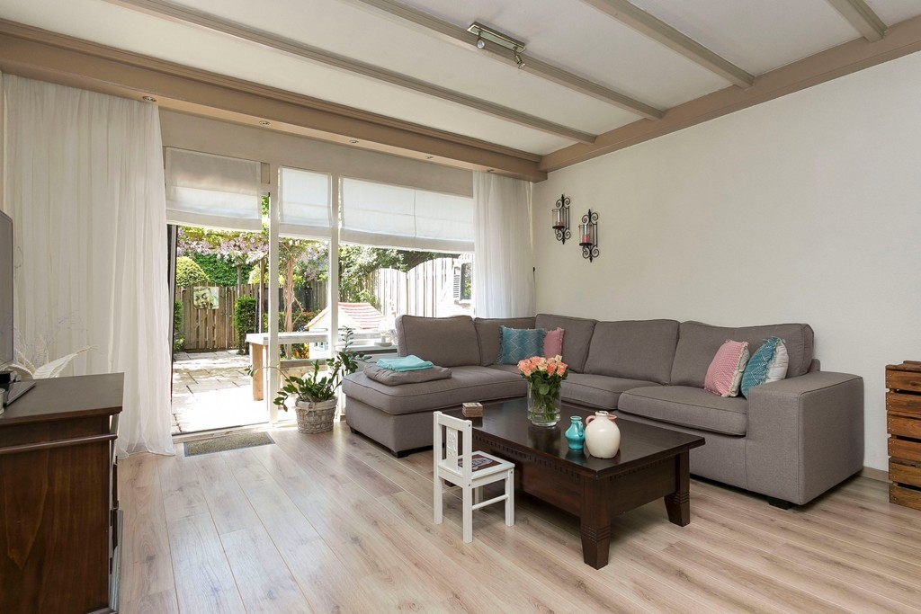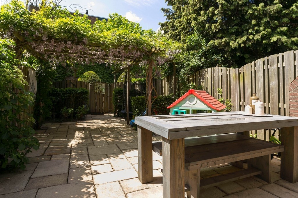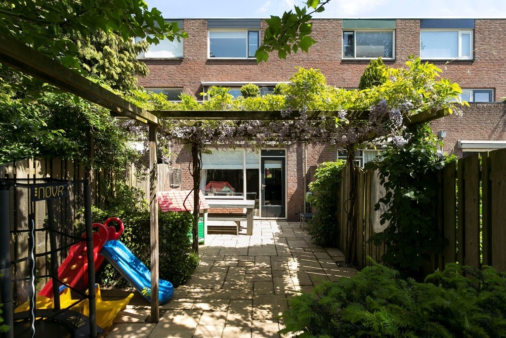De achtertuin op het westen is leuk aangelegd met een zonnig terras met zonwering, een grote pergola waar u onder een prachtige blauwe regen in de schaduw kunt zitten en daarachter is er nog een terras. De tuin biedt veel privacy. Hier kunt u lekker ontspannen en genieten van de mooie dagen.