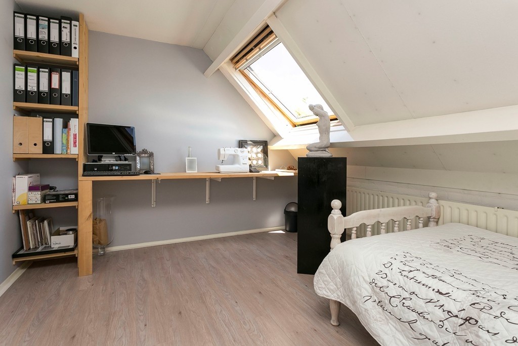 Twee ruim bemeten slaapkamers met laminaatvloeren, waarvan 1 met een op maat gemaakt bureau.