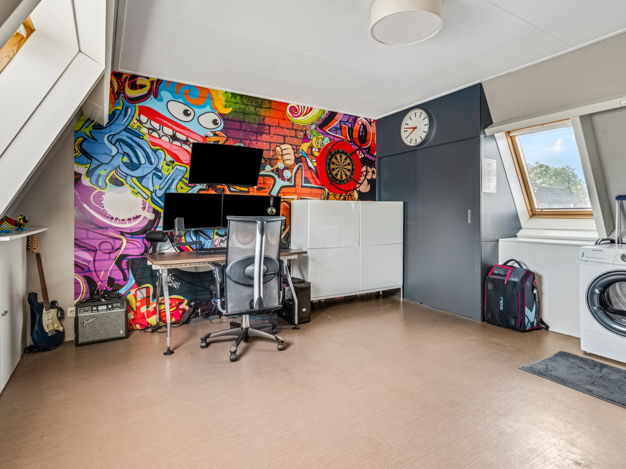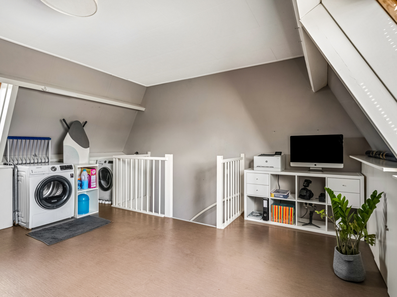 Ruime multifunctionele open zolder met was-apparatuur aansluitingen en opbergruimte achter de knieschotten. De zolder is voorzien van een vinylvloer en is dankzij de twee dakramen heerlijk licht.