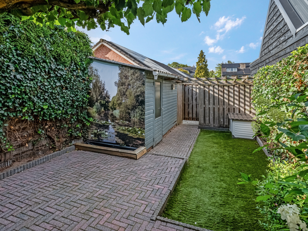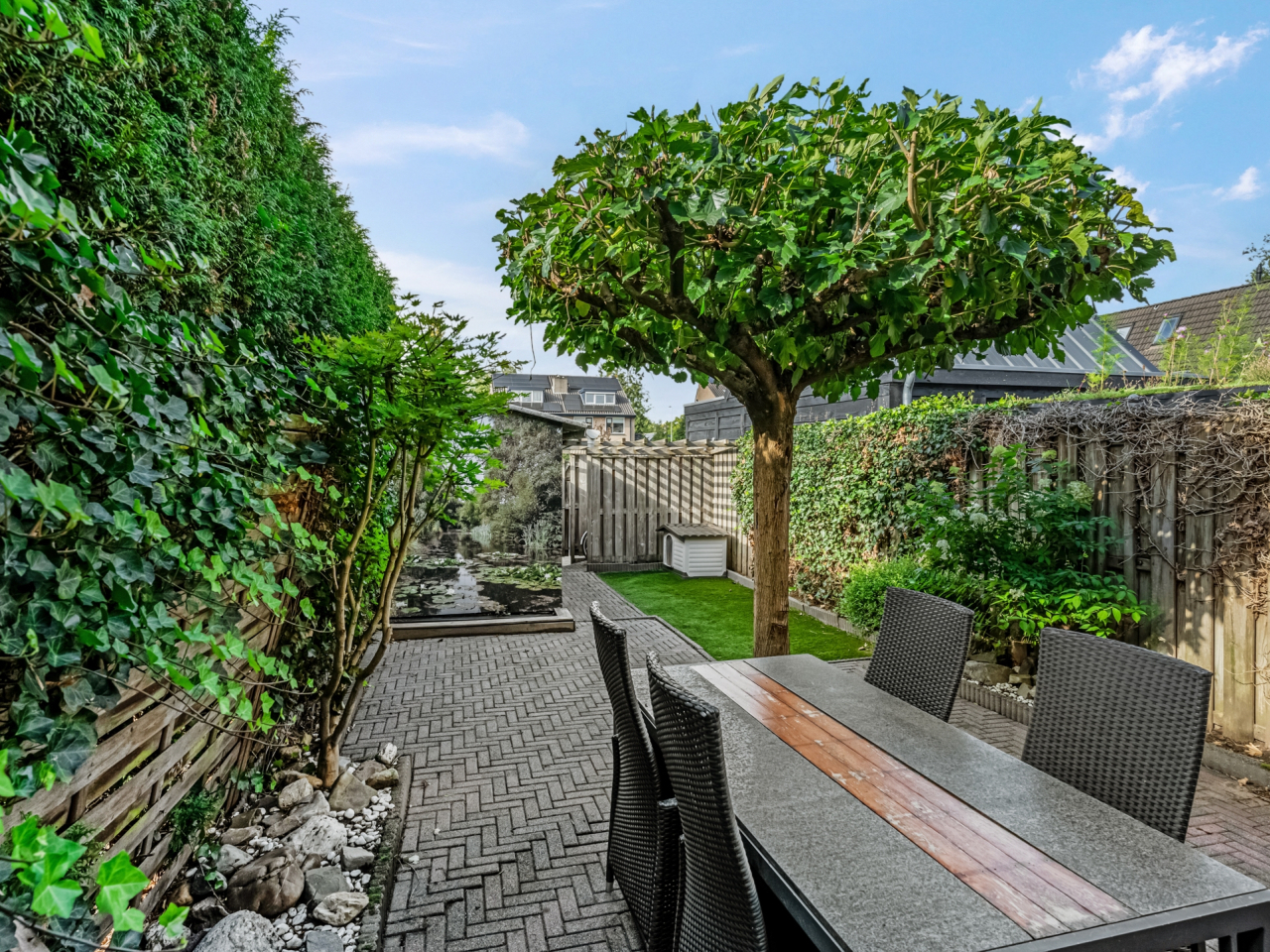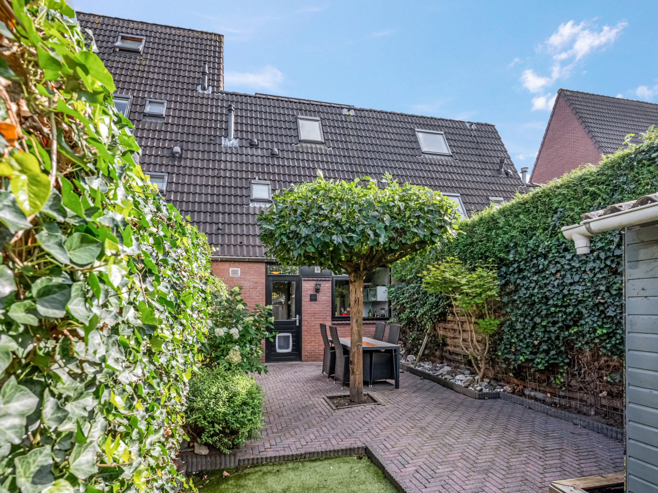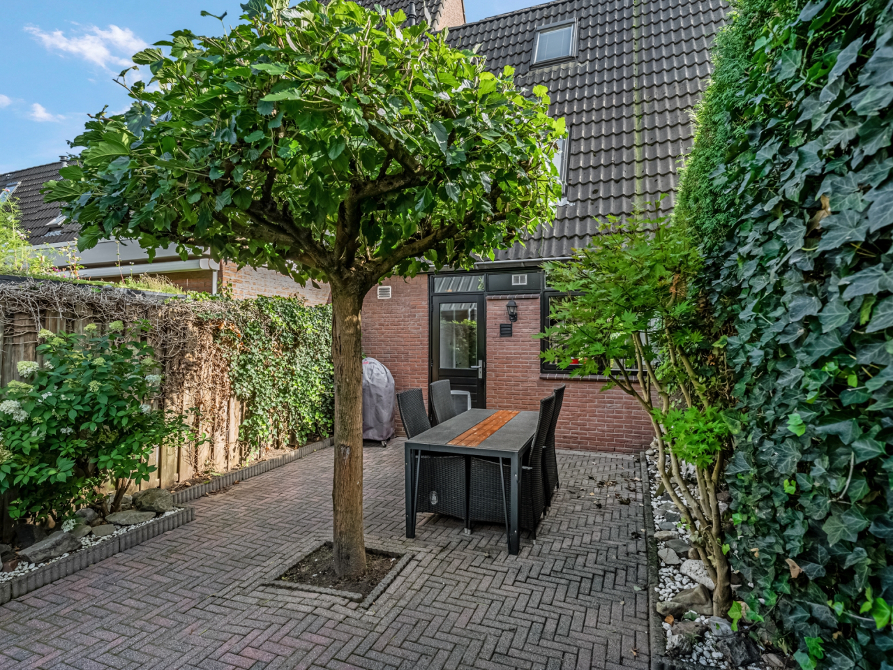 De verzorgde voortuin biedt door zijn beschutte indeling veel privacy en beschikt over diverse plantenperken en een terrasje. De gezellige achtertuin heeft eveneens een terras, een grasveldje, plantenperken en een achterom. De achtertuin grenst aan een parkeerplaats en biedt eveneens veel privacy.