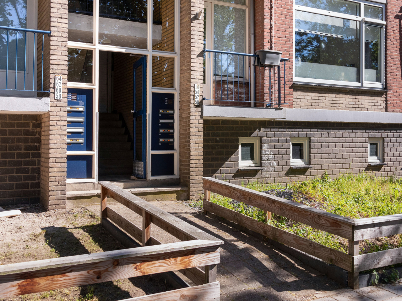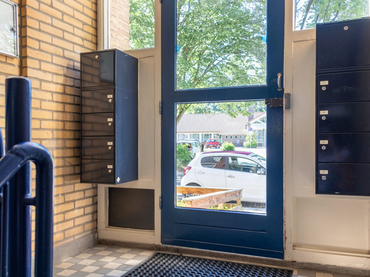 Afgesloten hoofdentree met brievenbussen en bel, trappenhuis naar de appartementen. De hoofdentree geeft toegang naar de fietsenberging en privé-berging.