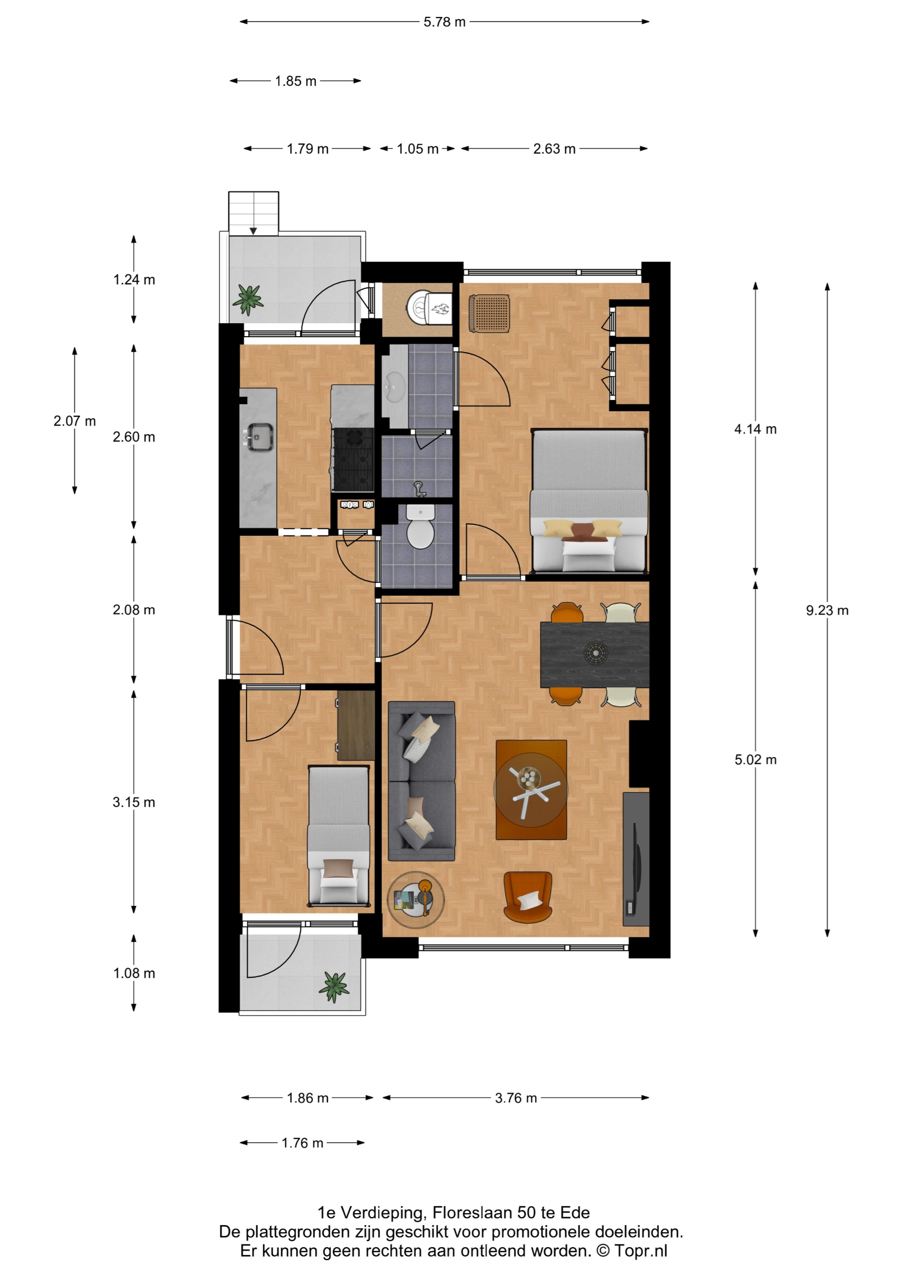 Het appartement is grotendeels voorzien van een nette laminaatvloer en in de keuken liggen plavuizen.