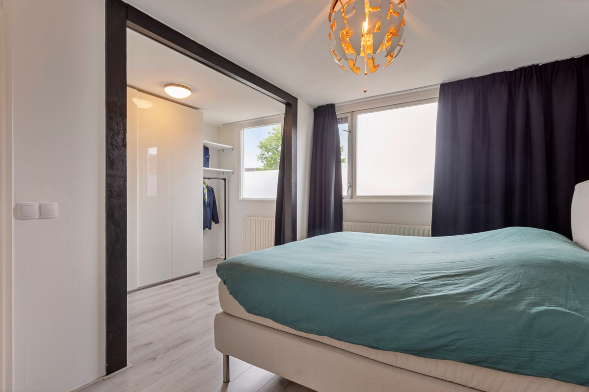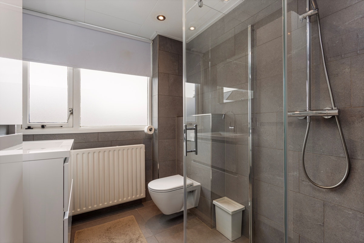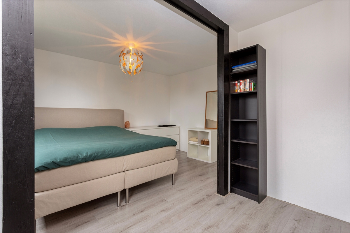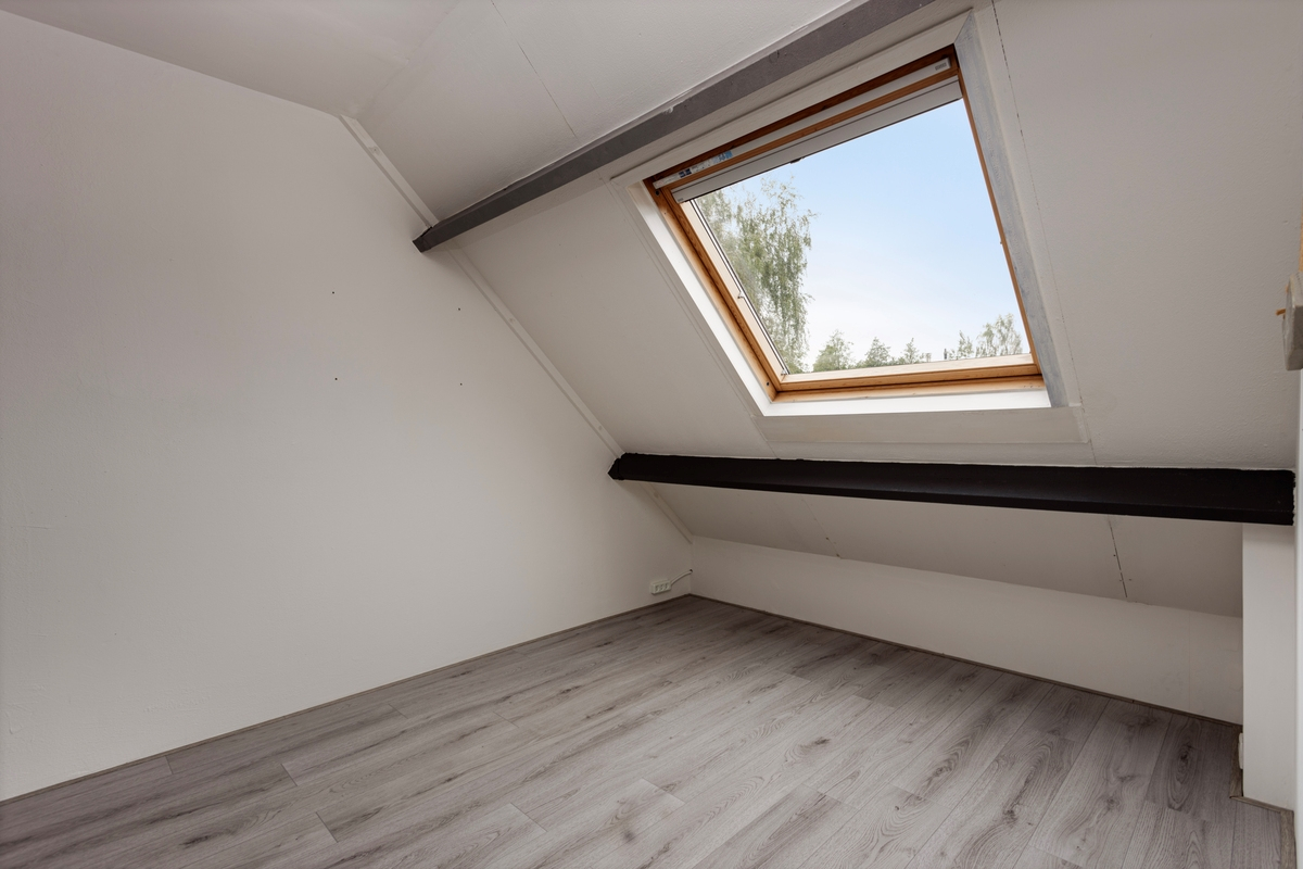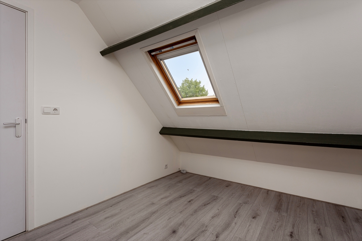 Vanaf de overloop bereiken we als eerste de royale ouderslaapkamer, welke bestaat uit een tweetal samengevoegde kamers (naar wens is dit vrij eenvoudig weer terug te brengen naar de oorspronkelijke staat). Momenteel is dit gedeelte in gebruik als inloopkast. Deze kamer is gesitueerd aan de voorzijde van de woning. Aan de achterzijde treffen we de tweede slaapkamer en de badkamer aan. Deze in 2019 gemoderniseerde badkamer is voorzien van een douchehoek, een wastafelmeubel en een zwevend toilet.