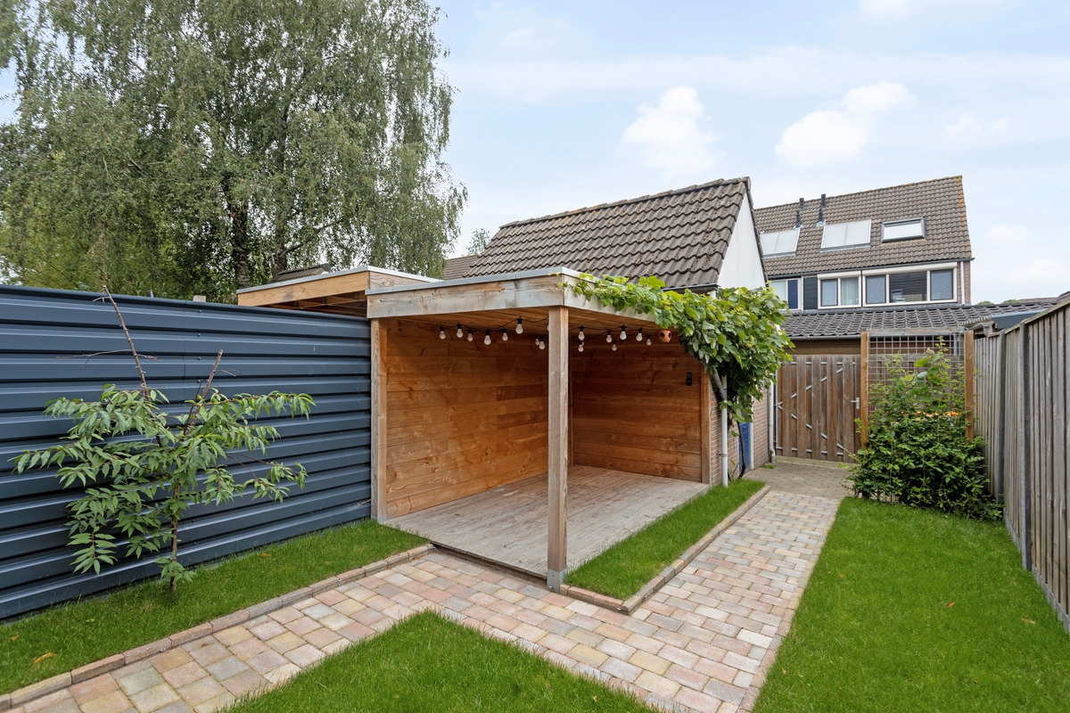 Voor- en achtertuin. De achtertuin is v.v. een stenen berging, houten veranda en een achterom.