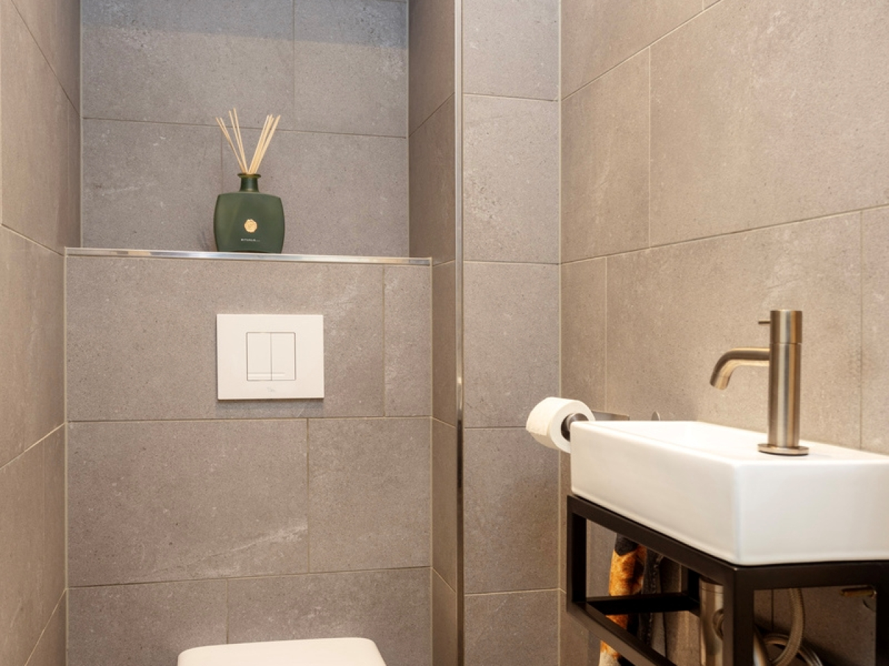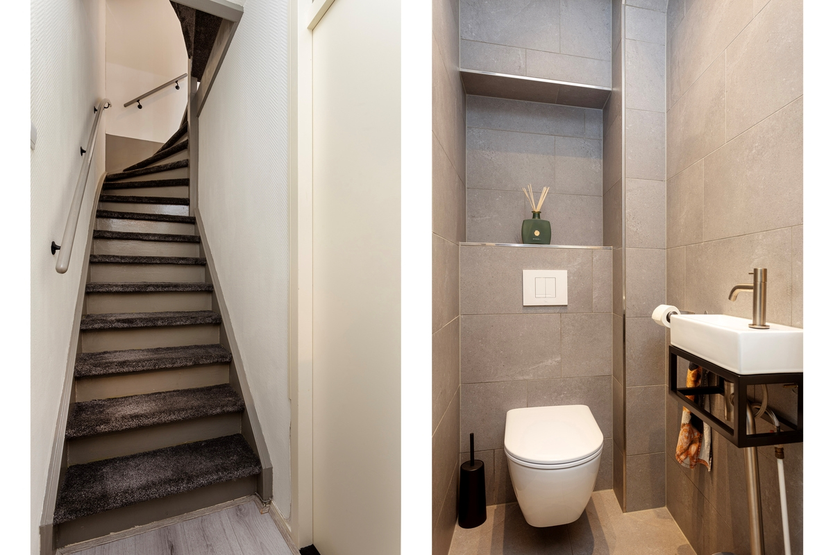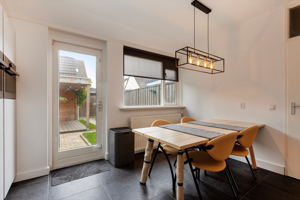 We komen binnen via de entree/hal met garderobe en meterkast. Als we doorlopen komen we in de keurig afgewerkte woonkamer met een fraaie maatwerk kastenwand, een praktische trapkast en een vrij zicht over het pleintje waaraan deze woning is gelegen. De moderne (2019) half open keuken bevindt zich aan de achterzijde en biedt ruimte voor een ruime eethoek. De keukenopstelling is geplaatst in een hoekopstelling en uitgerust met inbouwapparatuur, te weten; een koelkast, een vriezer, een vaatwasser, twee combi-magnetrons, een inductiekookplaat en een afzuigkap. Vanuit de keuken is de achtertuin bereikbaar. De achtertuin maakt een zeer verzorgde indruk en is uitgerust met een sfeervolle veranda en een stenen berging. Hier kan je prima met het hele gezin of vrienden genieten van de mooie dagen. Vanuit de keuken bereiken we tevens het tussenportaal met vanuit hier de trapopgang naar de eerste verdieping, alsmede de toiletruimte. Ook de toiletruimte is in 2019 gerenoveerd.