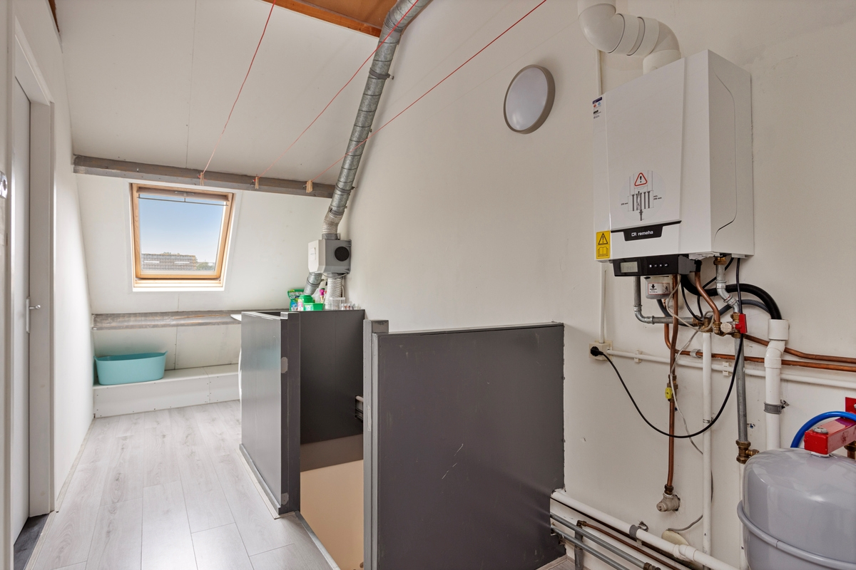 Voorzolder met CV-opstelling (Remeha – 2019 - CW5) met een daaraan gekoppelde zonneboiler, 100L, Remeha Zenta. Daarnaast vinden we op de overloop de aansluitingen voor de was-apparatuur en een mogelijkheid om de vliering in het puntje van het dak te bereiken. De tweede verdieping is voorzien van een tweetal nette slaapkamers met ieder een dakraam.