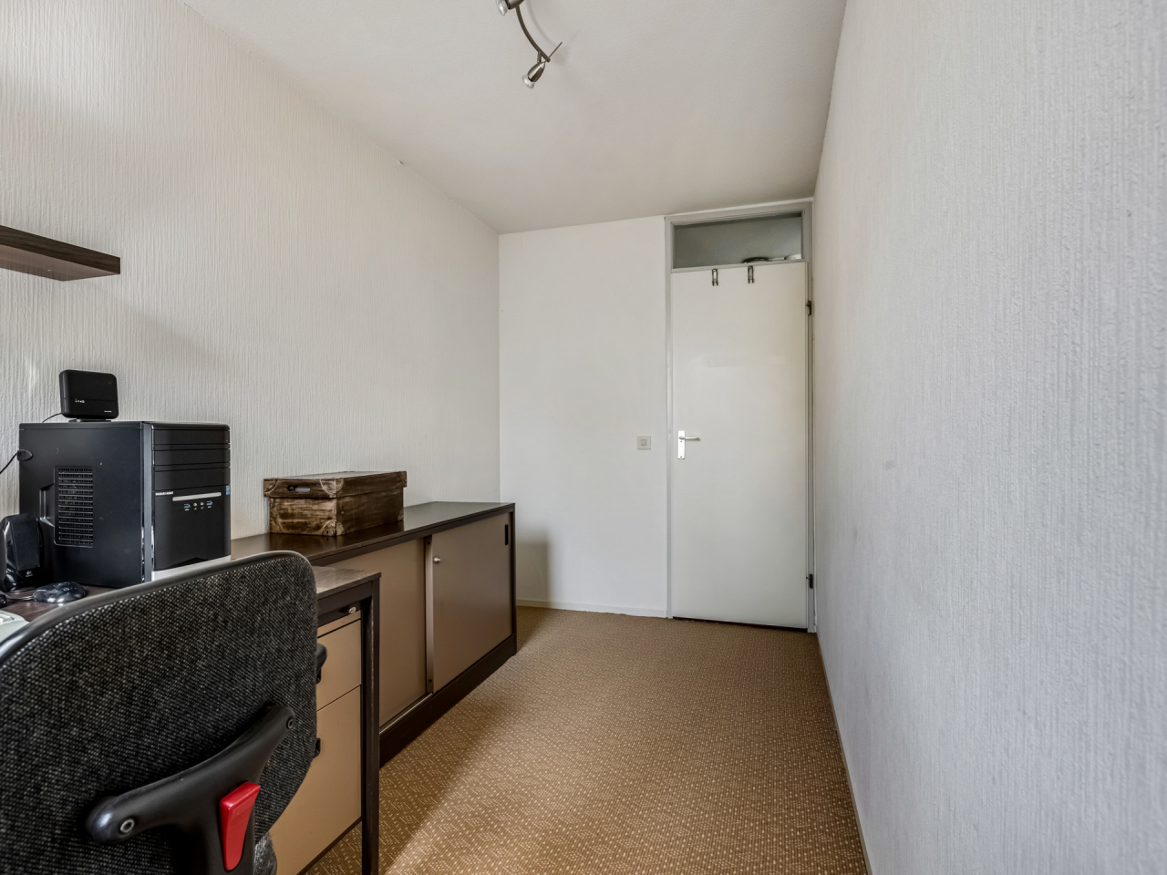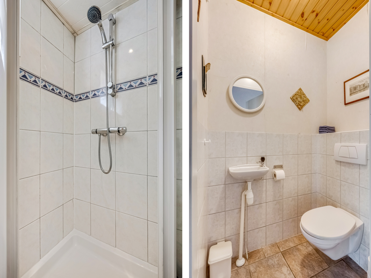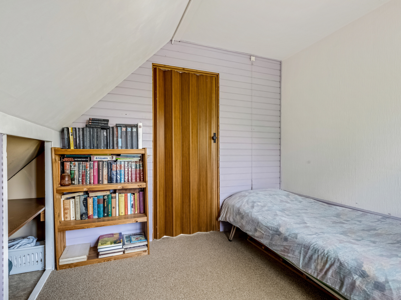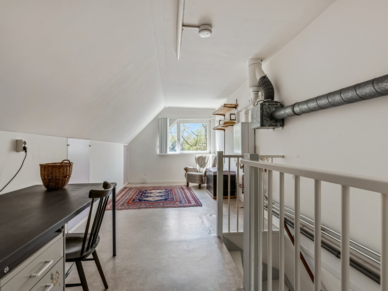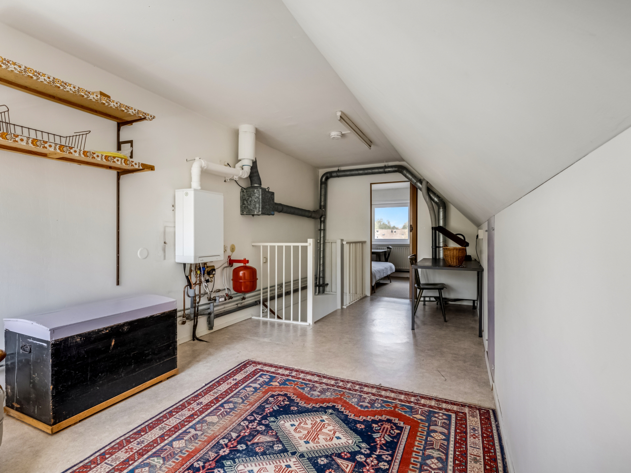 Voorzolder met stookruimte en een vierde slaapkamer. In de stookruimte bevindt zich de CV-ketel en de box voor de mechanische ventilatie. Hiernaast is tevens voldoende ruimte voor een werkplek of eventueel een 5e slaapkamer. Veel bergruimte achter het dakbeschot aanwezig.