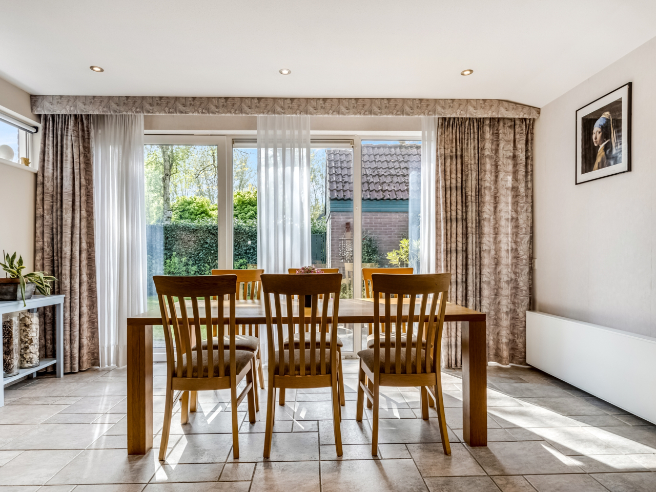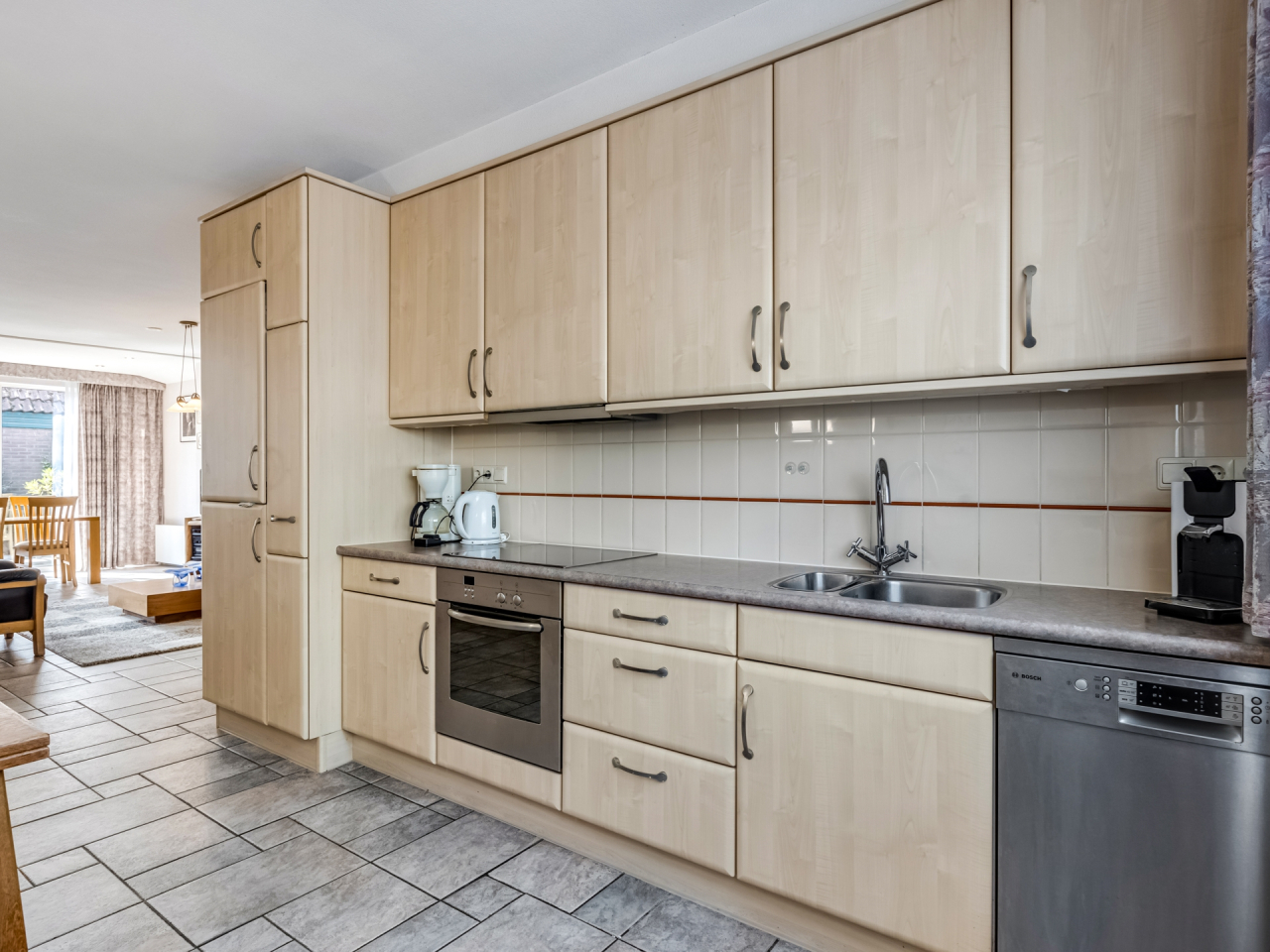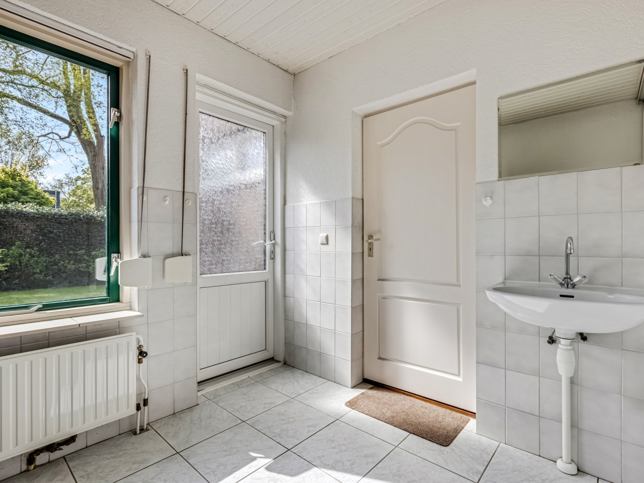 Overdekte entree, hal met garderobe-nis, meterkast en toegang tot het toilet, de woonkamer en de trapopgang naar de 1e verdieping. Heerlijk lichte uitgebouwde woonkamer waar de grote kunststof schuifpui voor veel natuurlijke lichtinval en uitzicht op de achtertuin zorgt. Aan de voorzijde bevindt zich de keukenopstelling met diverse inbouwapparatuur (o.a. een koelkast, vaatwasser, oven en inductiekookplaat). Vanuit de woonkamer is de bijkeuken bereikbaar met veel kastruimte, een wastafel en aansluitingen voor de was-apparatuur. Ruime garage met elektra en elektrisch bedienbare garagedeur. Tevens is er parkeergelegenheid op eigen terrein.