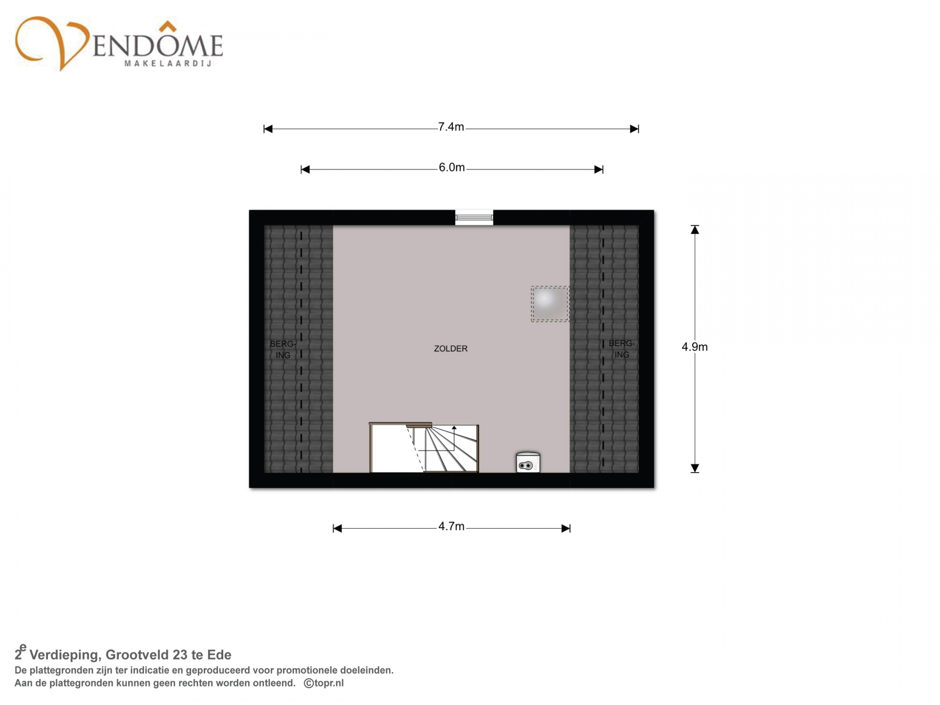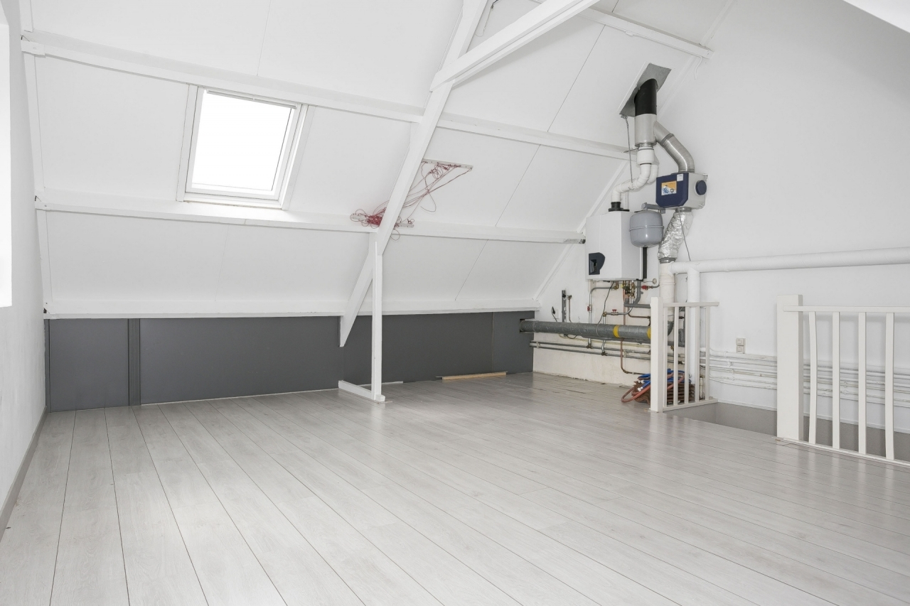 De ruime zolder die met een vaste trap bereikbaar is, bestaat momenteel uit één grote ruimte met laminaatvloer en Veluxraam. De mogelijkheid bestaat om hier op eenvoudige wijze een vierde slaapkamer te realiseren. Op deze verdieping is tevens de opstelplaats voor de CV ketel (Atag, 2015) en de mechanische ventilatie-unit aanwezig.