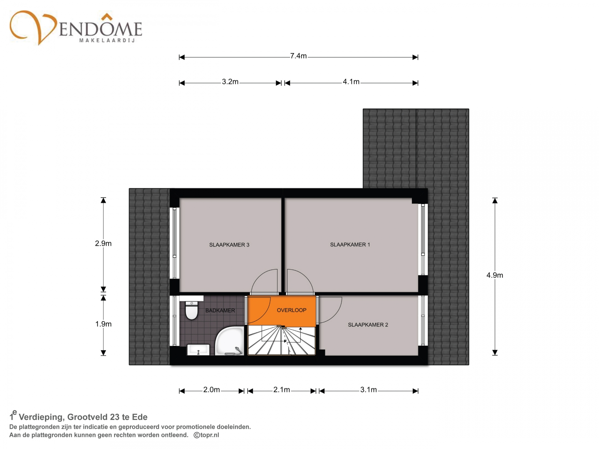 Aangekomen op de eerste etage treft u hier 3 ruime slaapkamers met laminaatvloeren, alsmede de badkamer. De moderne badkamer is praktisch ingericht en voorzien van een wastafel, douchecabine en tweede toilet.