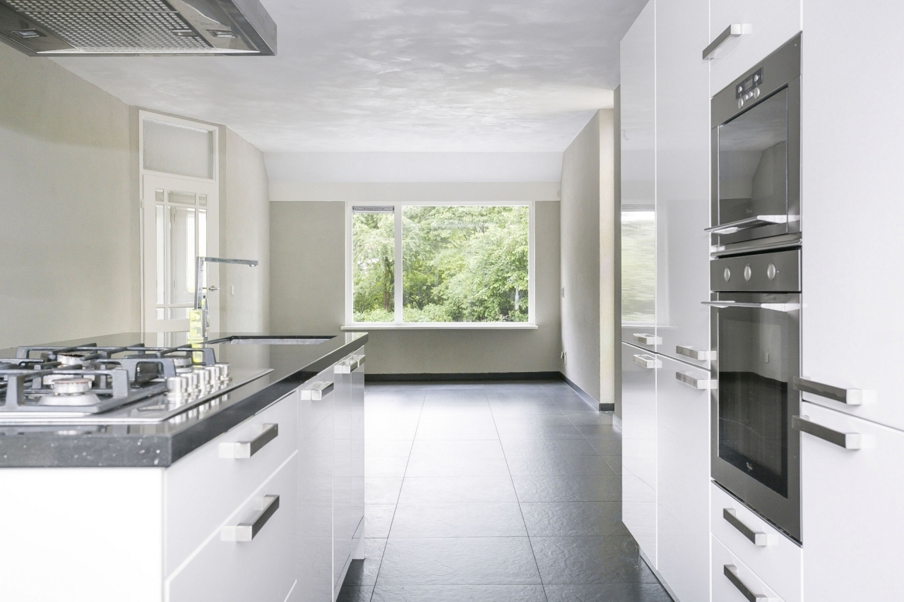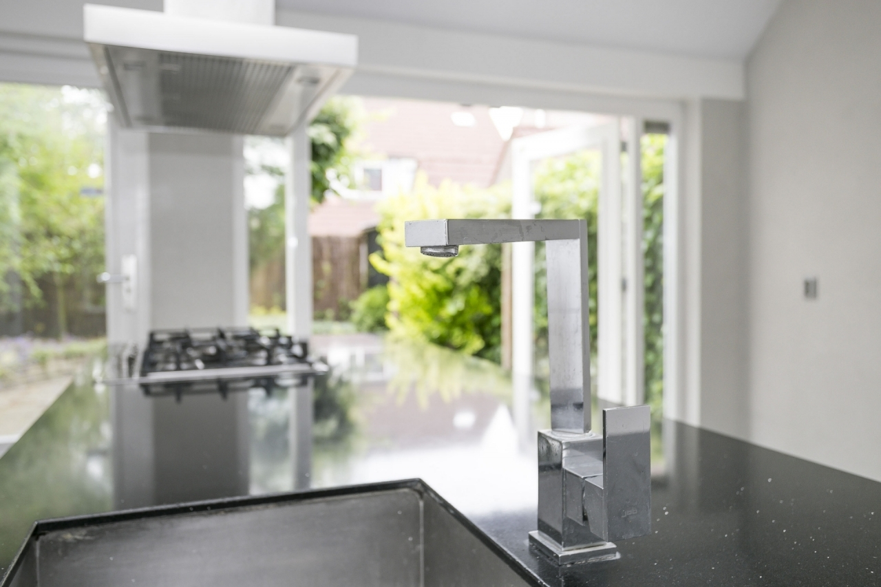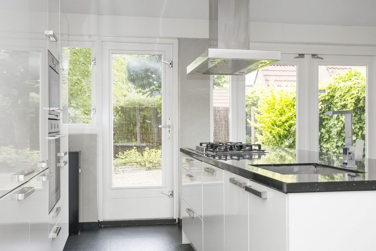 Entree, hal, meterkast. Toegang tot de woonkamer met luxe keuken voorzien van een riant kookeiland, granieten werkbladen en de volgende inbouwapparatuur: 5-pits gasfornuis, afzuigkap, oven, magnetron, koel/vriescombinatie en vaatwasser. Via de openslaande deuren is de achtertuin te bereiken.