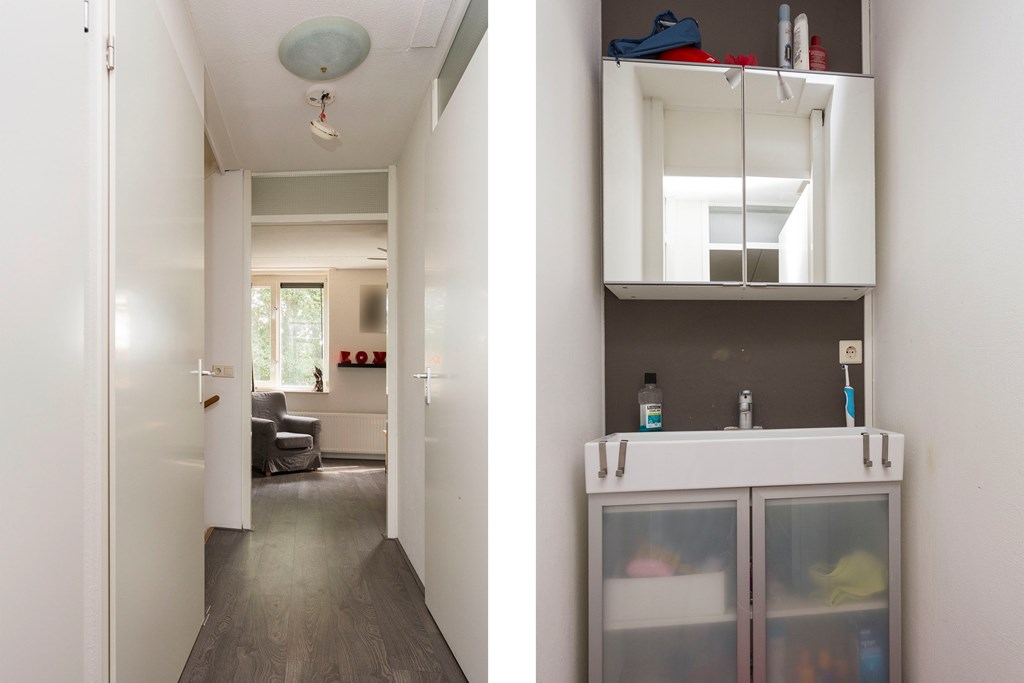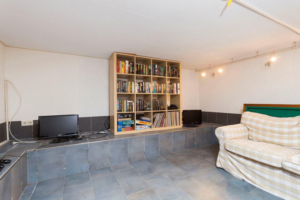 Ruime entree met meterkast (6 groepen en 2 aardlekschakelaars), slaapkamer die tevens als praktijkruimte gebruikt kan worden en een wasruimte met aansluitingen voor de wasmachine en droger en berging voor fietsen. Bijzonder is de aanwezigheid van een goed afgewerkt souterrain voorzien van vloerverwarming die goed als opberg-, speel- of hobbyruimte kan dienen.