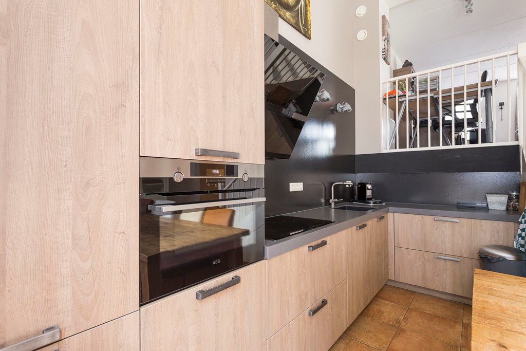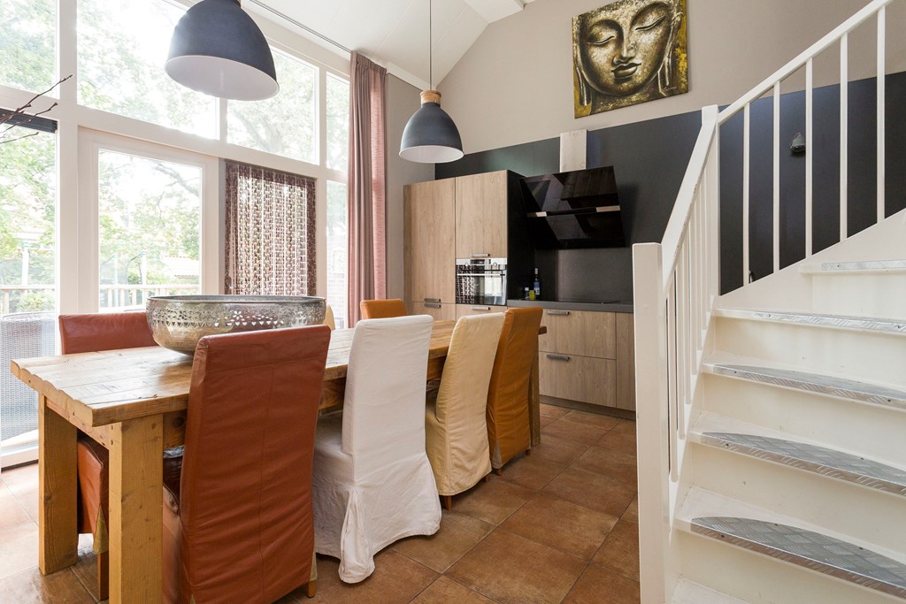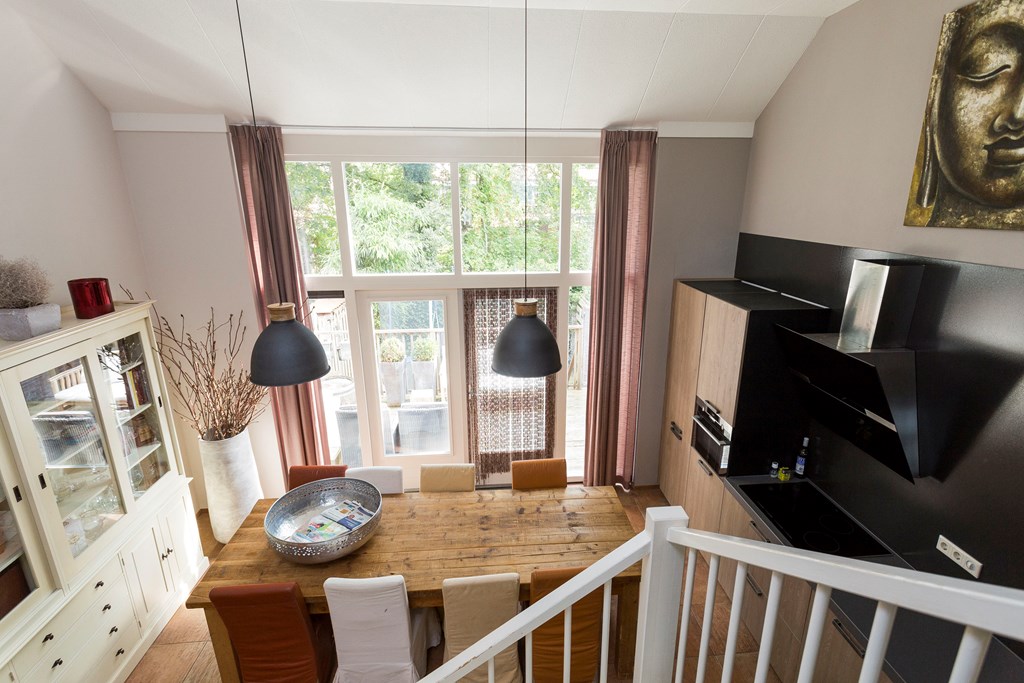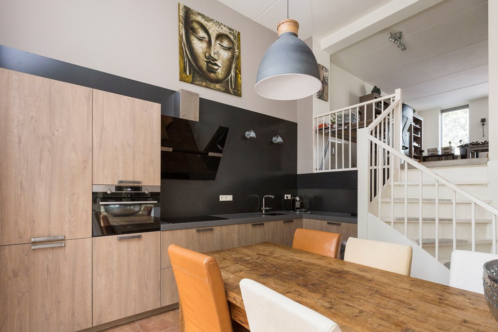 Royale woon-/eetkeuken waar het aan een lange tafel lekker Bourgondisch genieten is met familie of vrienden. Uniek aan deze ruimte is de grote raampartij en het hoge plafond wat zorgt voor licht en ruimtelijkheid. De luxe keuken (2017) is voorzien van alle gemakken waaronder een composiet werkblad, krasvaste en slijtvrije “Bokmerk” achterwand, inductiekookplaat, design afzuigkap, combimagnetron, koel/vries- combinatie, vaatwasser en vloerverwarming. Openslaande deuren bieden toegang tot het terras.