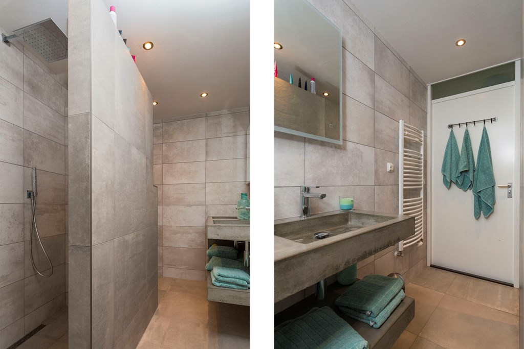 Overloop, ruimte met een extra wastafel, 3 slaapkamers met laminaatvloeren waarvan de ouder-slaapkamer zich aan de achterzijde van de woning bevindt. De luxe badkamer is voorzien van een dubbele wastafel van glad beton, spiegel met verlichting, inloopdouche met hand- en stortdouche, tweede toilet, design radiator en inbouwspotjes.