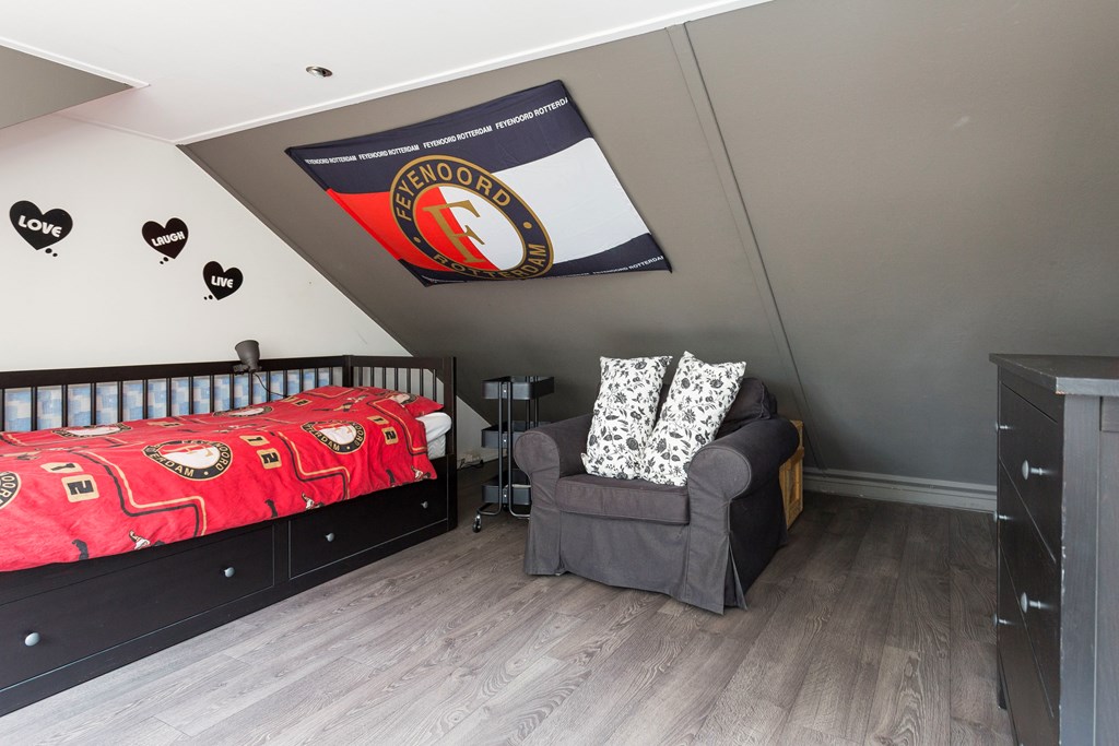 Via een vaste trap is de droom van elk kind bereikbaar, namelijk een ruime vijfde zolder slaapkamer met laminaatvloer en dakkapel .