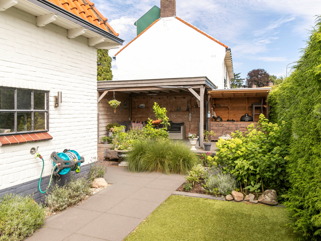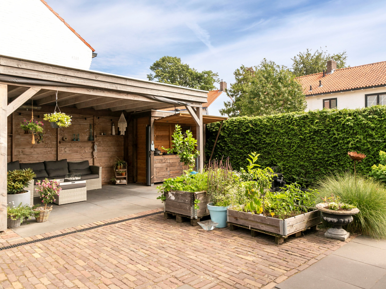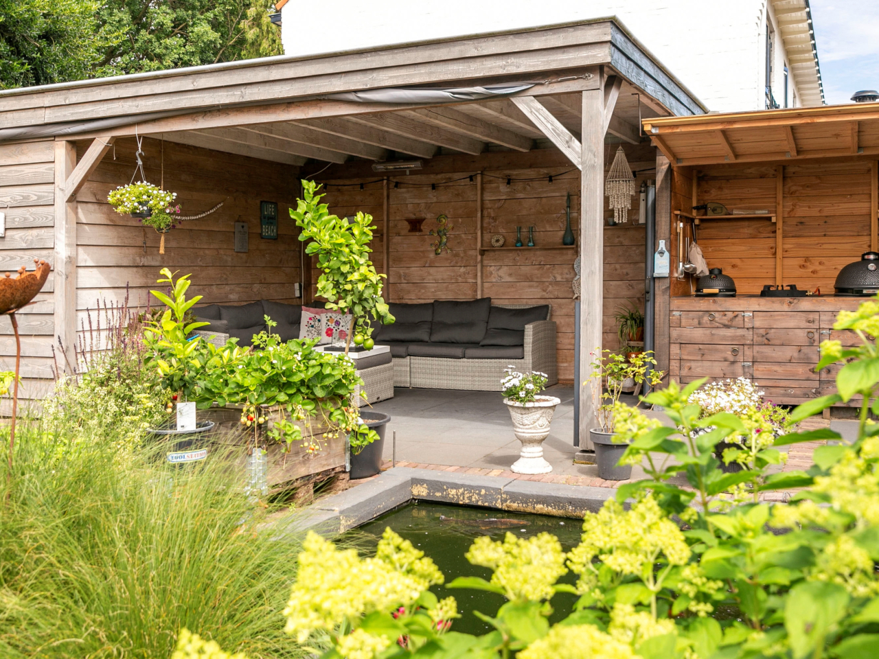 De voortuin is omheind door een rode beukhaag die veel privacy biedt en is v.v. een kunstgrasveldje en diverse bloemenperken. De achtertuin is op het zuidoosten gelegen en beschikt over een combinatie van leuke ouderwetse klinkers en grote tegels die een fijn terras vormen, verschillende bloemenperken en een vijver. Tevens is er een aangebouwde stenen berging met elektra, ventilatie-unit en de CV ketel opstelling (Atag – 2007 - in eigendom). Achter in de tuin bevindt zich nog een royale veranda waar u lekker van de zomermaanden kunt profiteren. Hier bevindt zich ook nog een aangebouwde houten berging met elektra. De veranda is ook voorzien van een mooie buitenkeuken, de barbecues zijn eventueel ter overname.