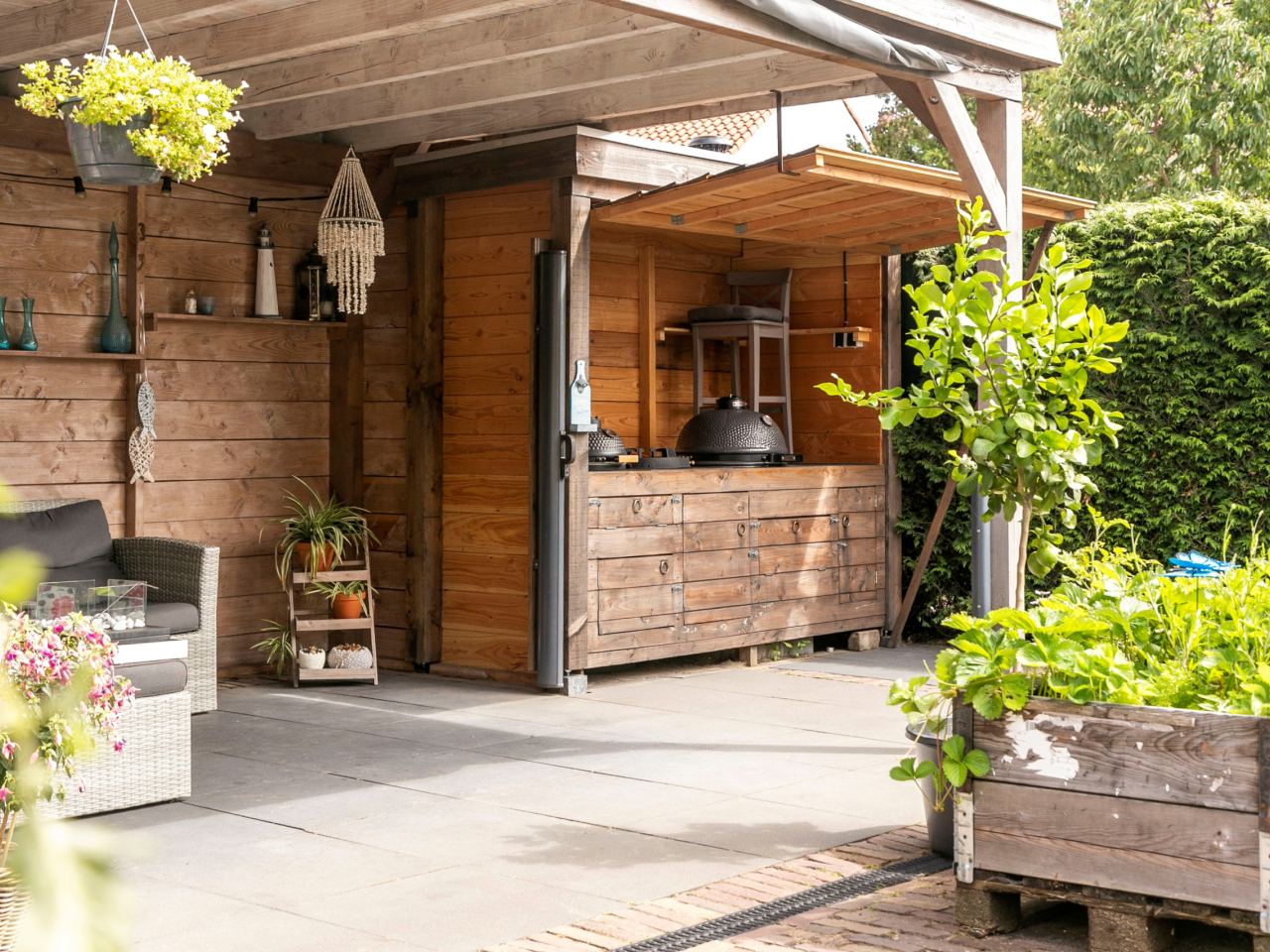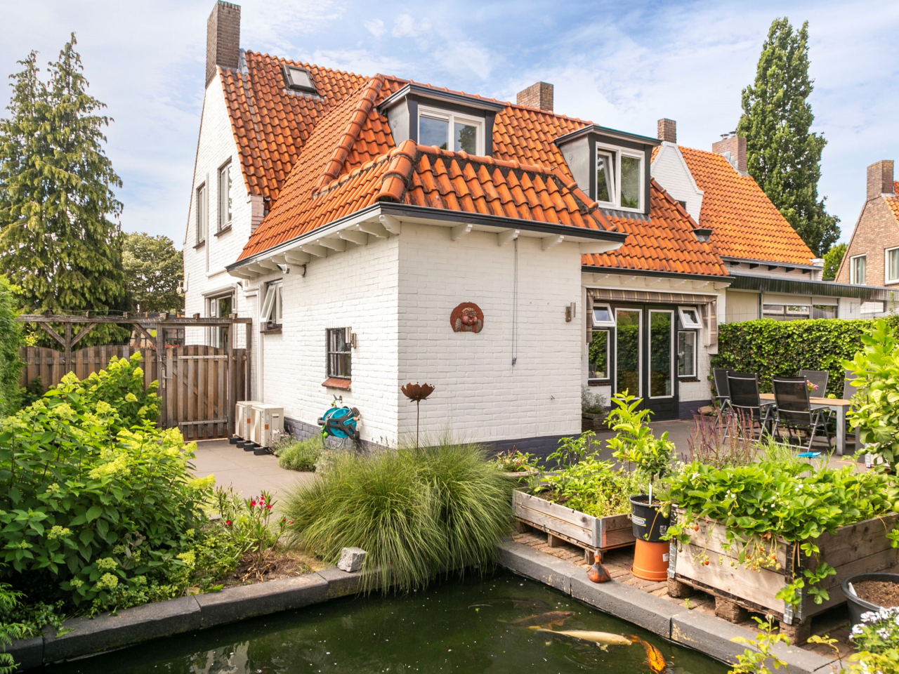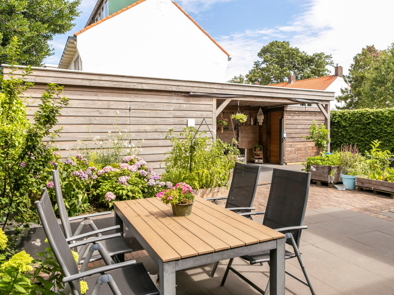 De voortuin is omheind door een rode beukhaag die veel privacy biedt en is v.v. een kunstgrasveldje en diverse bloemenperken. De achtertuin is op het zuidoosten gelegen en beschikt over een combinatie van leuke ouderwetse klinkers en grote tegels die een fijn terras vormen, verschillende bloemenperken en een vijver. Tevens is er een aangebouwde stenen berging met elektra, ventilatie-unit en de CV ketel opstelling (Atag – 2007 - in eigendom). Achter in de tuin bevindt zich nog een royale veranda waar u lekker van de zomermaanden kunt profiteren. Hier bevindt zich ook nog een aangebouwde houten berging met elektra. De veranda is ook voorzien van een mooie buitenkeuken, de barbecues zijn eventueel ter overname.