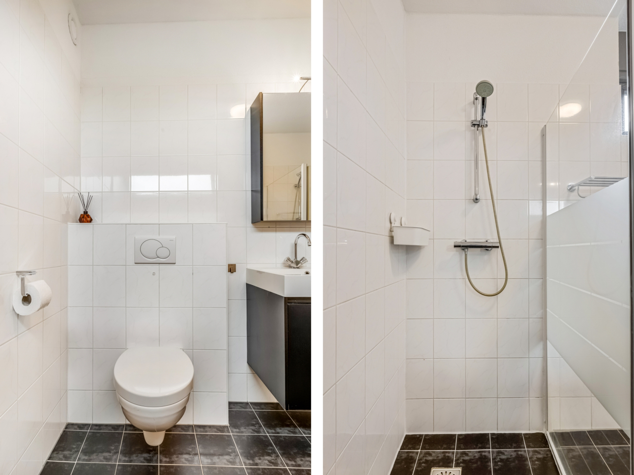 Op de eerste verdieping bevinden zich drie slaapkamers van goed formaat. De moderne badkamer is ruim opgezet en biedt plaats aan een inloopdouche, tweede toilet en een stijlvol wastafelmeubel. Verder vindt u op deze verdieping een technische ruimte met de CV-ketel en aansluitingen voor wasmachine en droger.