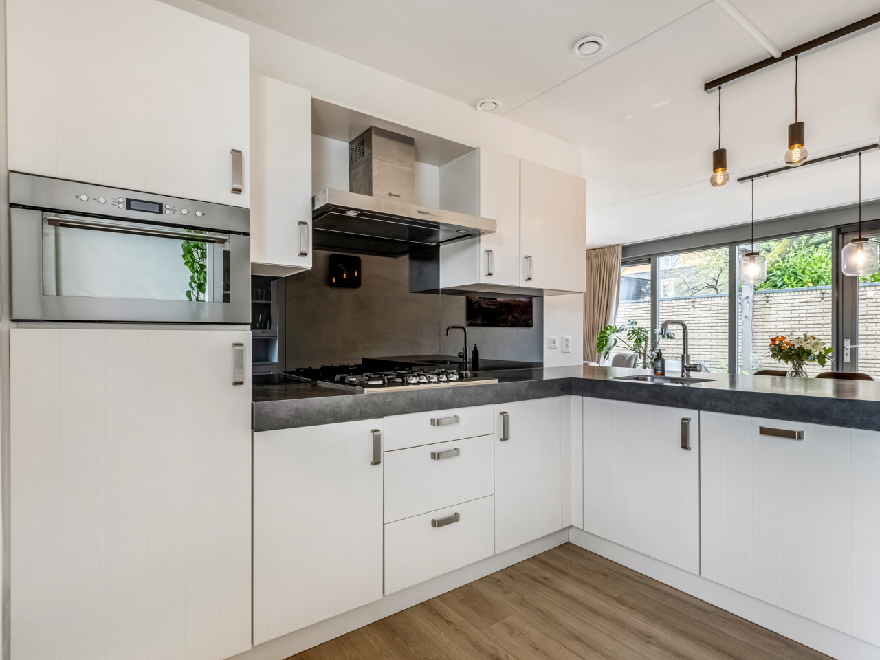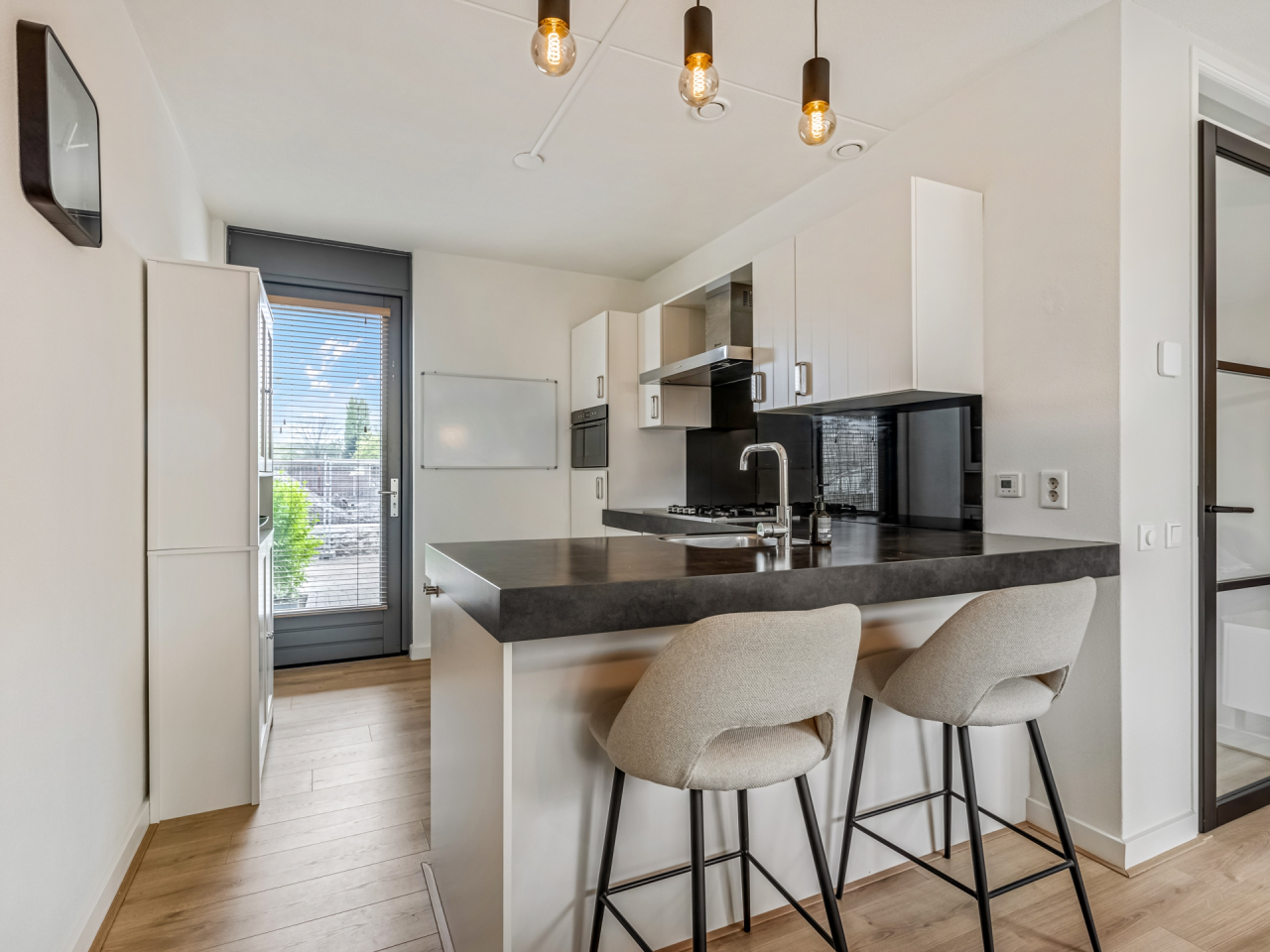 De laminaatvloer op de begane grond is recent geheel vernieuwd en er is een nieuwe zwarte houten deur met glas tussen de woonkamer en de hal geplaatst, hetgeen ook weer voor extra daglicht zorgt. Aan de voorzijde is de complete keuken gesitueerd, uitgevoerd in een eigentijdse stijl met een schiereiland met barretje en voorzien van diverse inbouwapparatuur. Vanuit de woonkamer heeft u toegang tot de gezellige en fraai aangelegde achtertuin.