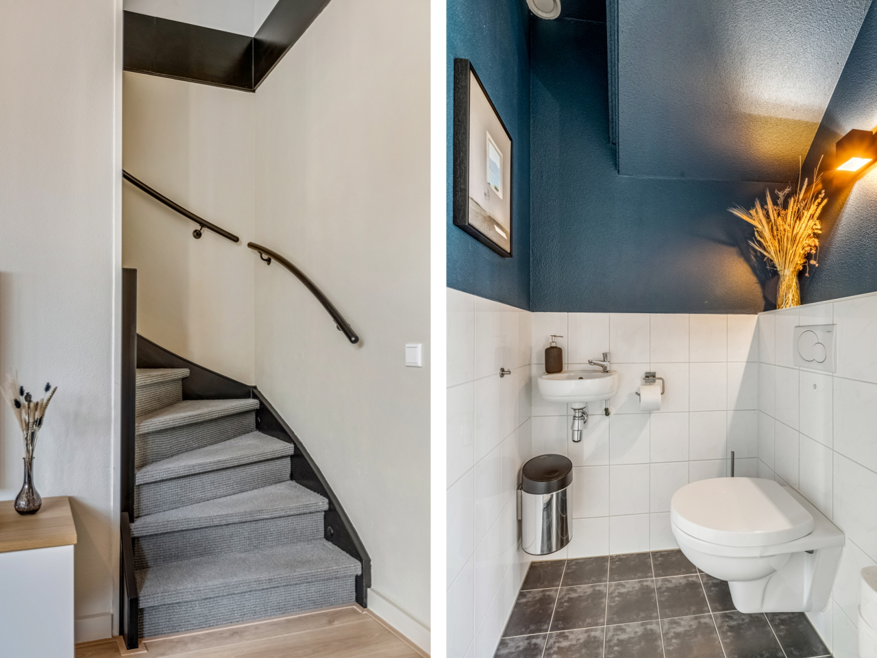 U betreedt de woning via de eigen oprit en een overdekte entree. In de hal bevinden zich de meterkast, garderobe en een modern afgewerkt toilet met hangend closet en fonteintje. De ruime, lichte woonkamer is voorzien van grote ramen, wat zorgt voor een prettige lichtinval. Hier is voldoende ruimte voor een zit- en eethoek en er is een open trap naar boven.