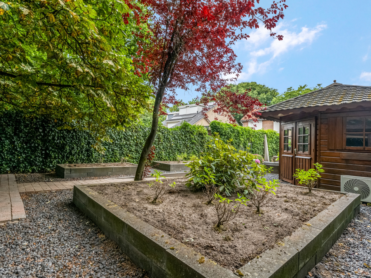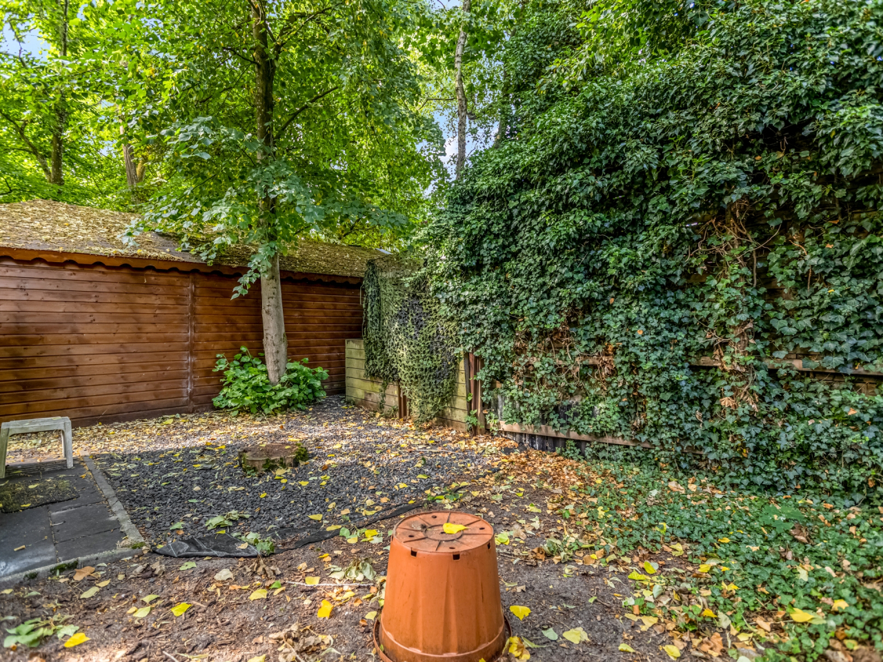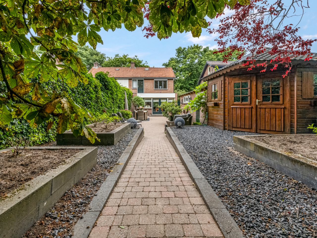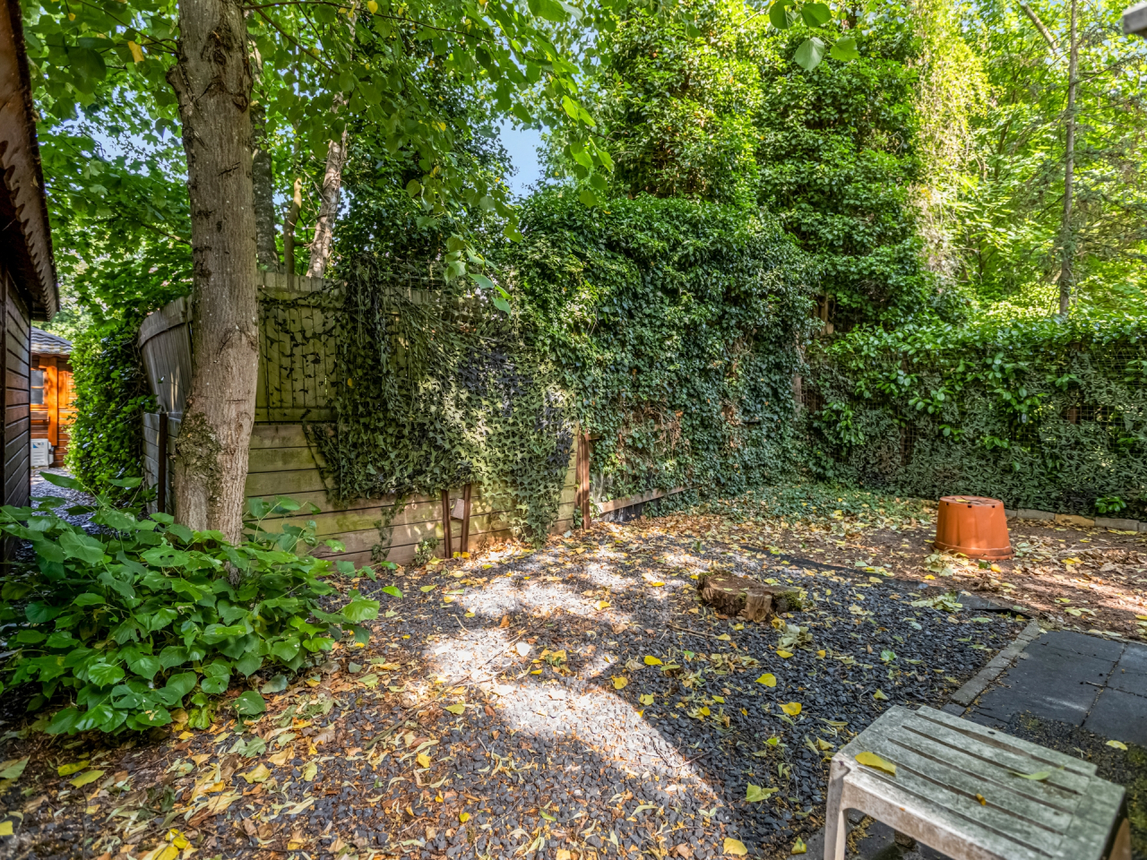 De achtertuin is uitzonderlijk diep (ca. 32 meter) en fraai aangelegd met diverse plantenperken, bloemen, bomen en meerdere terrassen. Je kunt op elk moment van de dag kiezen voor zon of schaduw. Dankzij de ligging op het oosten, geniet je van een heerlijke ochtendzon. De tuin is onderhoudsarm aangelegd en biedt veel privacy. Via een poort aan de zijkant is de tuin ook bereikbaar vanaf de oprit.
