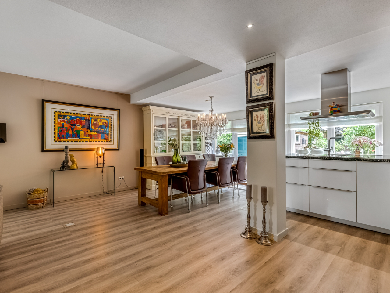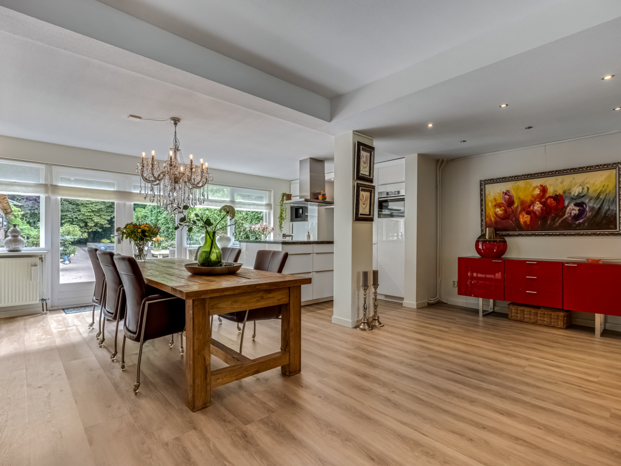 Aansluitend aan de keuken bevindt zich de eethoek met ruimte voor een lange eettafel (6–8 personen). Via openslaande deuren is er direct toegang tot de diepe achtertuin – ideaal voor het binnen-buitenleven. Aan de buitenkant is de woonkamer voorzien van rolluiken.