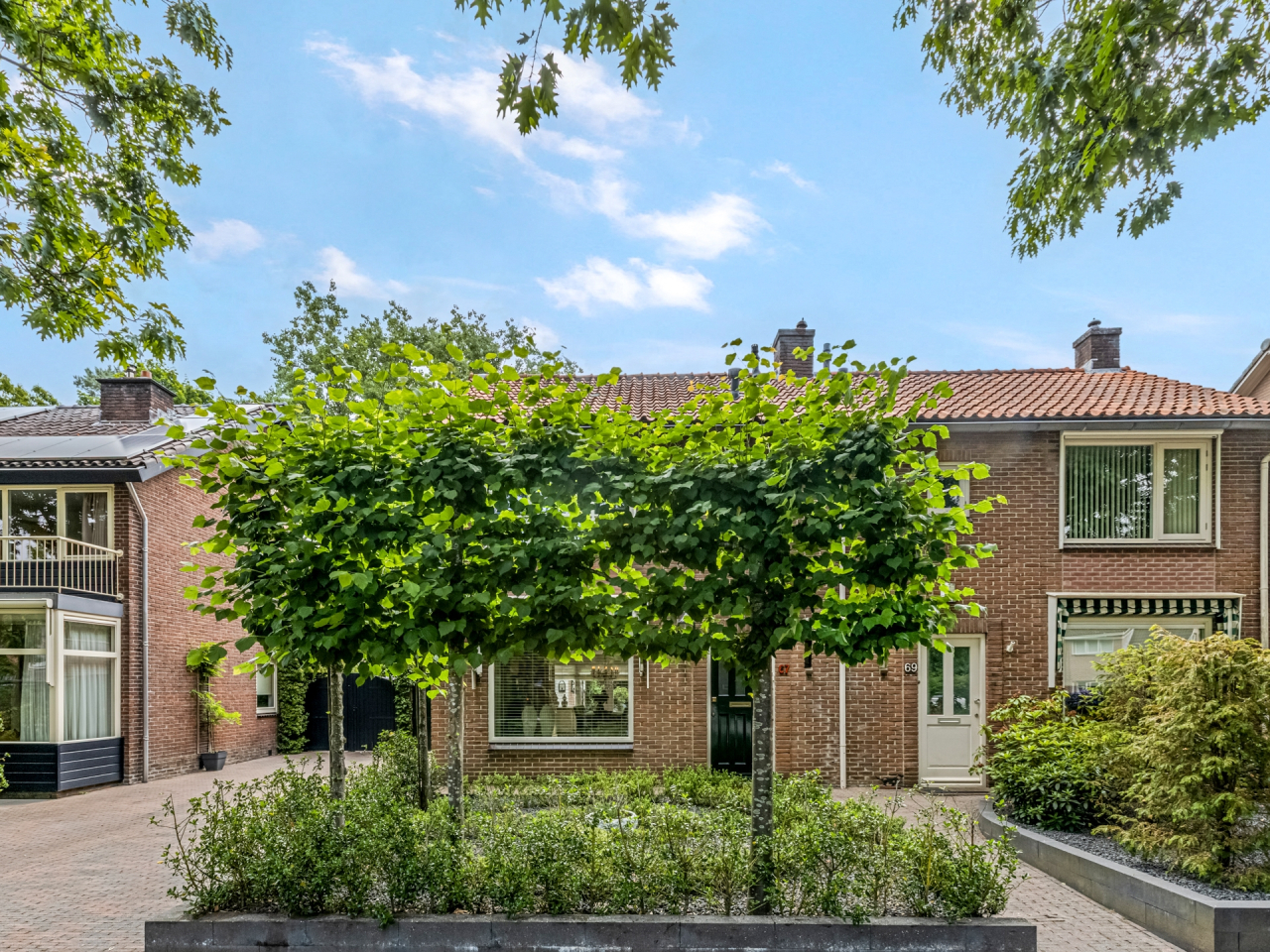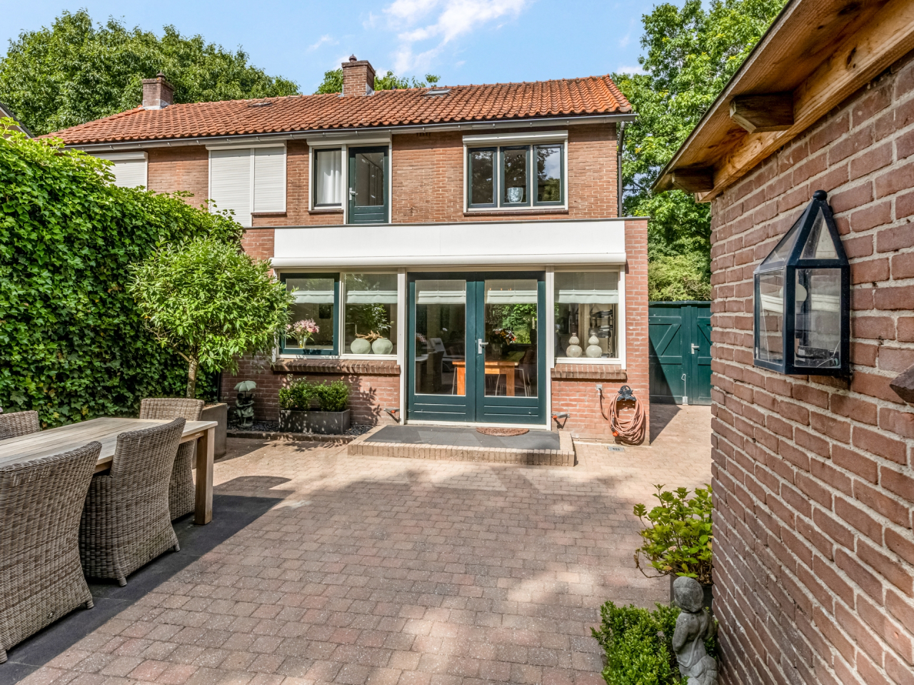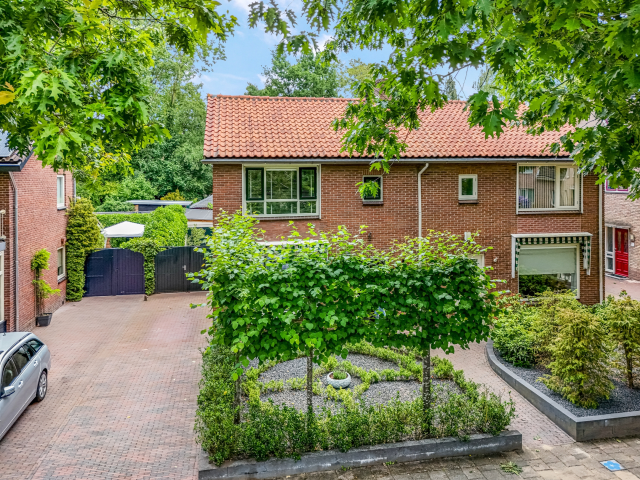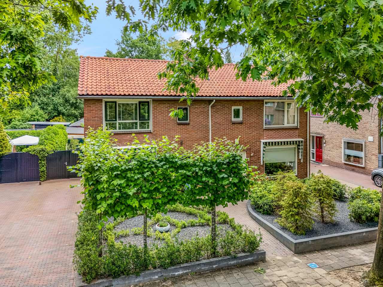 Via de statige voortuin met strakke indeling en leilinden bereik je de voordeur, fraai omlijst en passend bij de charmante uitstraling van het huis. Aan de gevel bevindt zich een elektrisch zonnescherm.