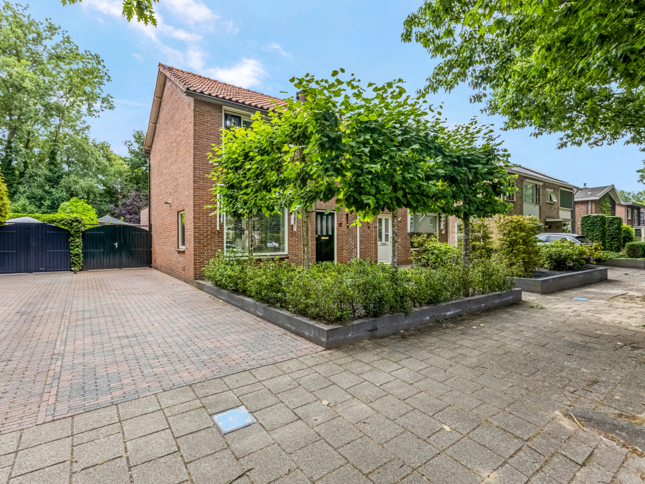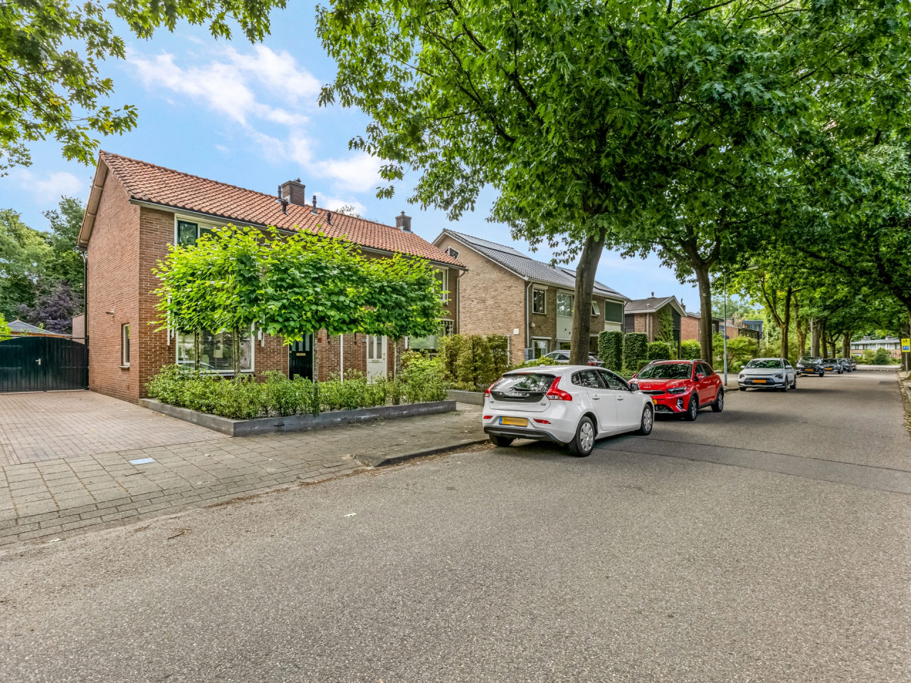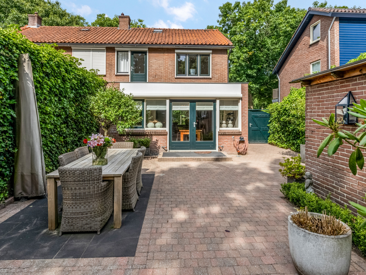 Via de statige voortuin met strakke indeling en leilinden bereik je de voordeur, fraai omlijst en passend bij de charmante uitstraling van het huis. Aan de gevel bevindt zich een elektrisch zonnescherm.