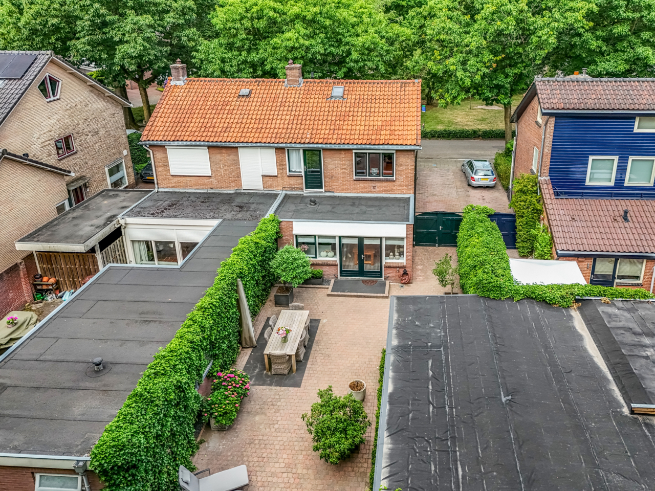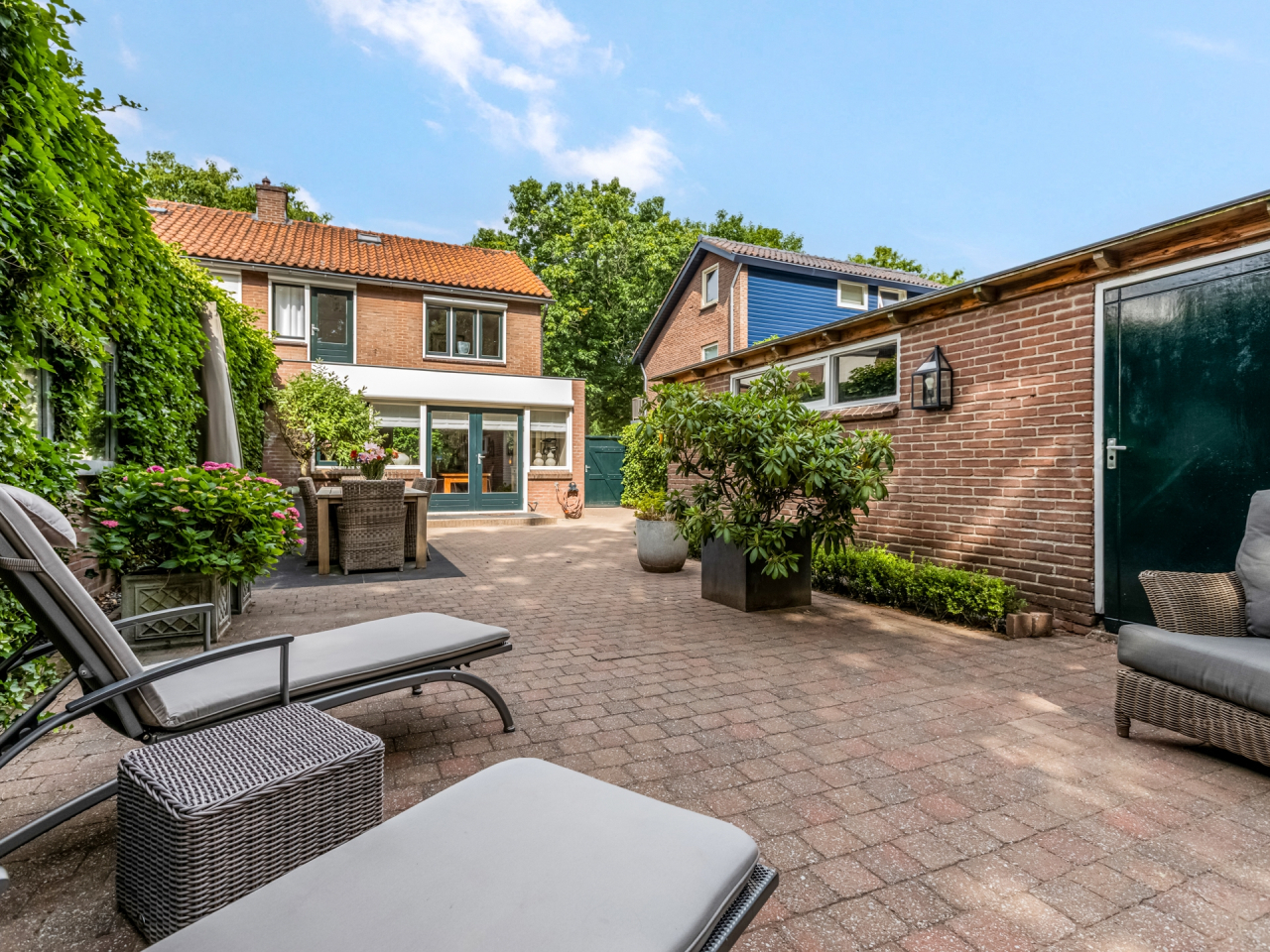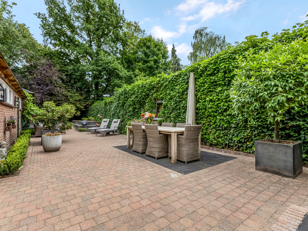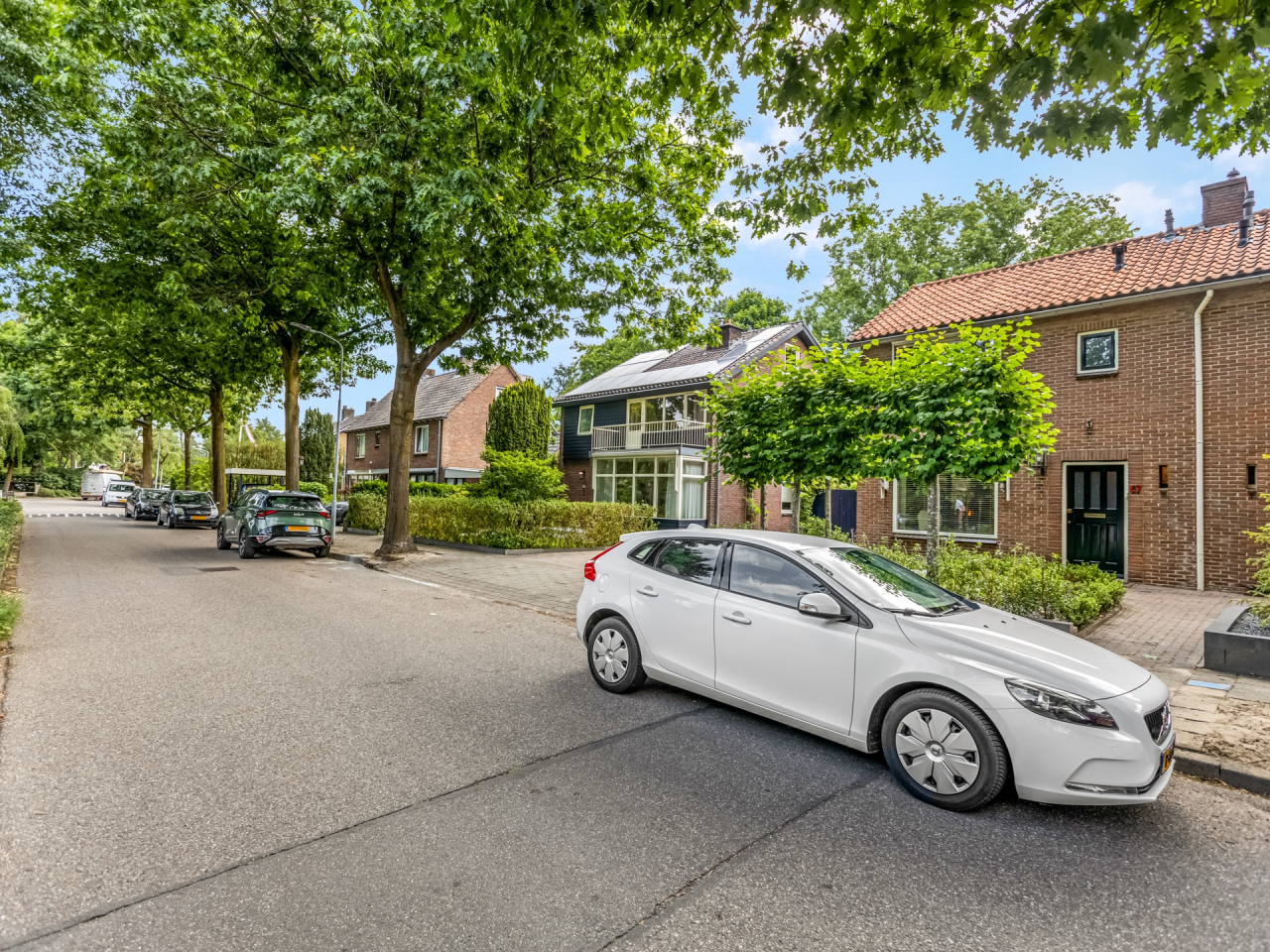 Via de statige voortuin met strakke indeling en leilinden bereik je de voordeur, fraai omlijst en passend bij de charmante uitstraling van het huis. Aan de gevel bevindt zich een elektrisch zonnescherm.