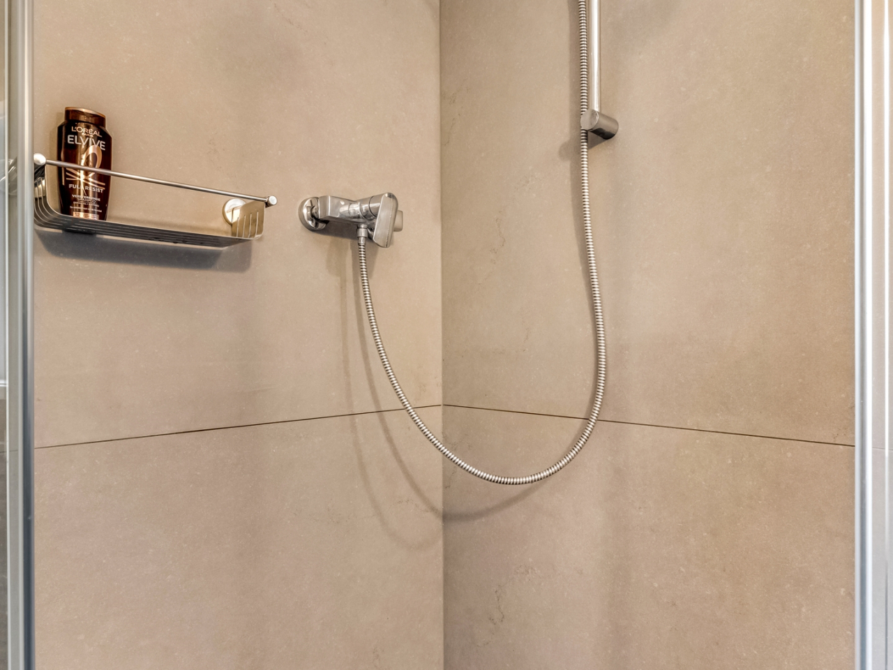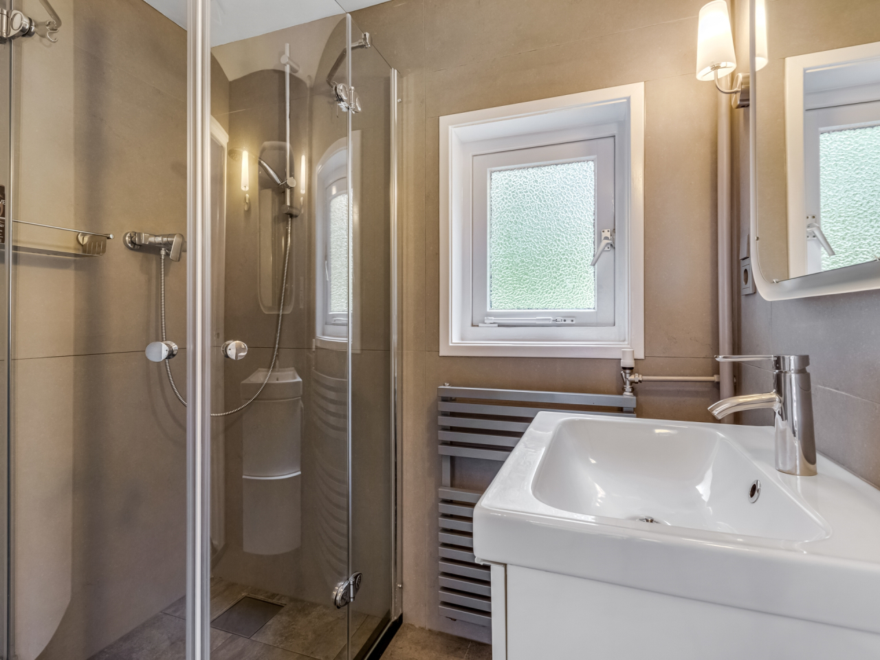 De badkamer is compact en voorzien van een douche, wastafelmeubel met spiegel en stopcontact, handdoekradiator en een raam voor natuurlijk daglicht.