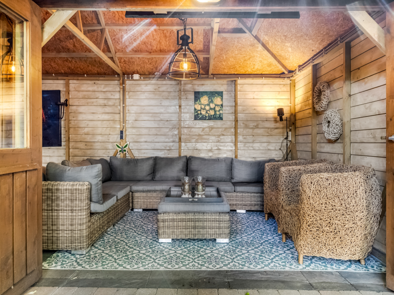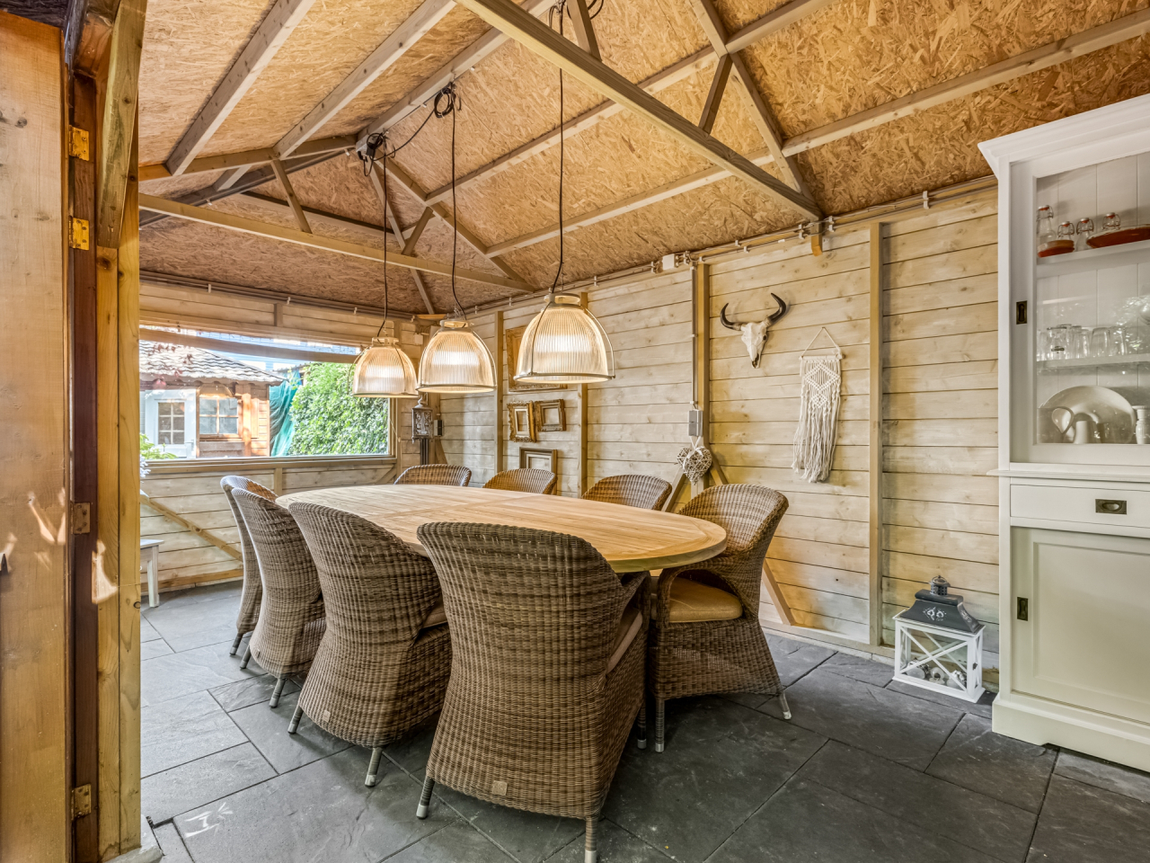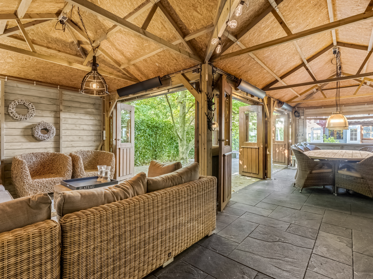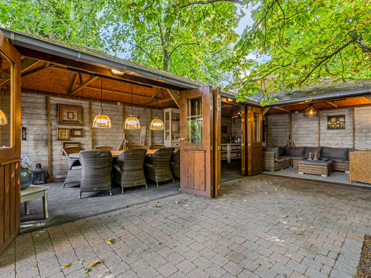 De grote houten tuinkamer/veranda van ca. 35 m² is een absolute eyecatcher. Deze ruimte is afsluitbaar met opvouwbare deuren en voorzien van infrarood verwarming – perfect als tweede woonkamer of buitenkeuken. Een plek waar je het hele jaar door kunt genieten van buitenleven, ongeacht het weer.