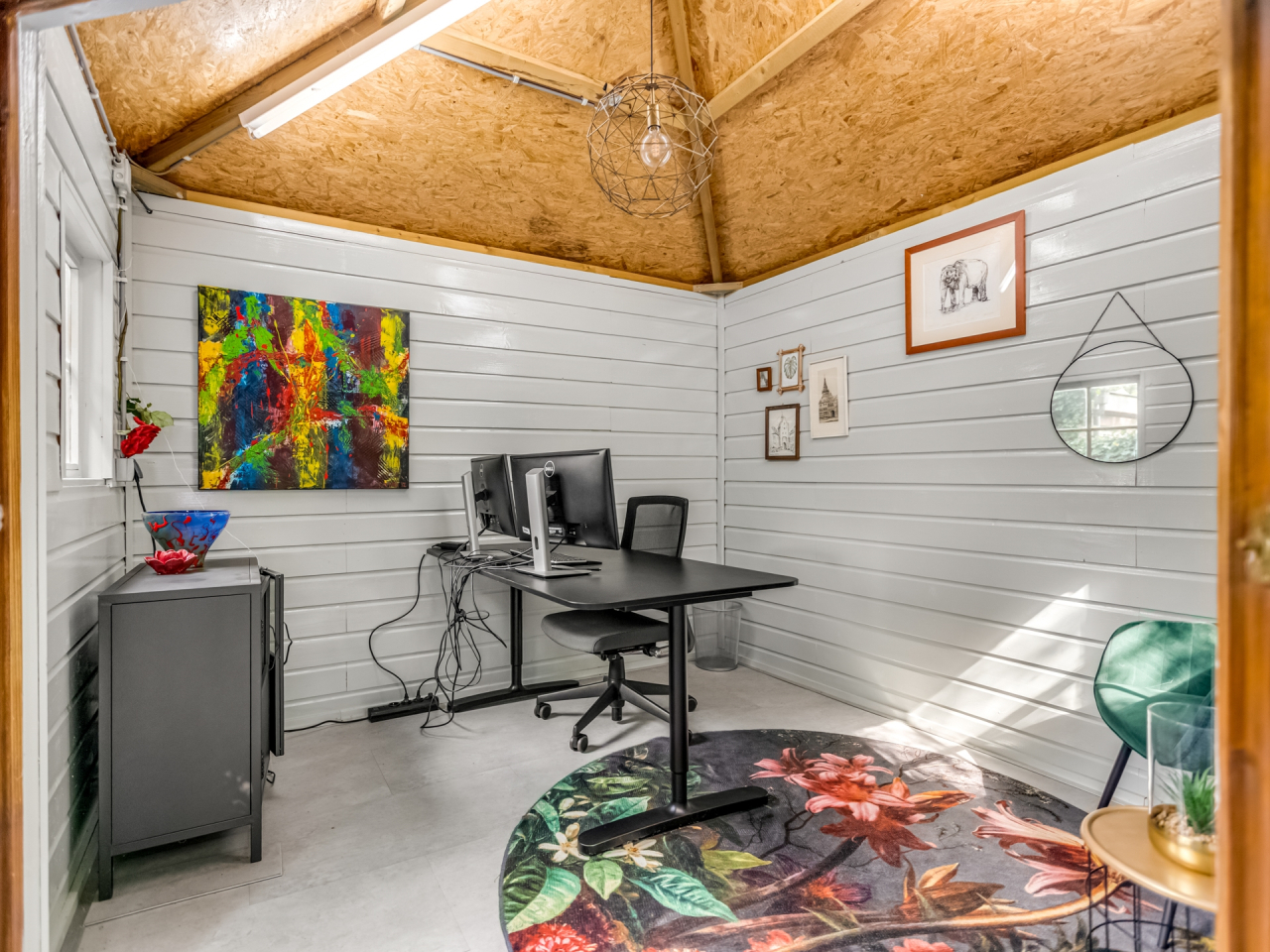 De lange oprit biedt plek voor twee auto’s en leidt naar een vrijstaande stenen garage (ca. 5,16 x 2,77 m), met een aansluitende stenen berging. Beide zijn voorzien van elektra.. Achter de berging bevindt zich een houten tuinhuis, dat nu in gebruik is als kantoor. Deze ruimte is voorzien van een airco-unit die zowel kan koelen als verwarmen.