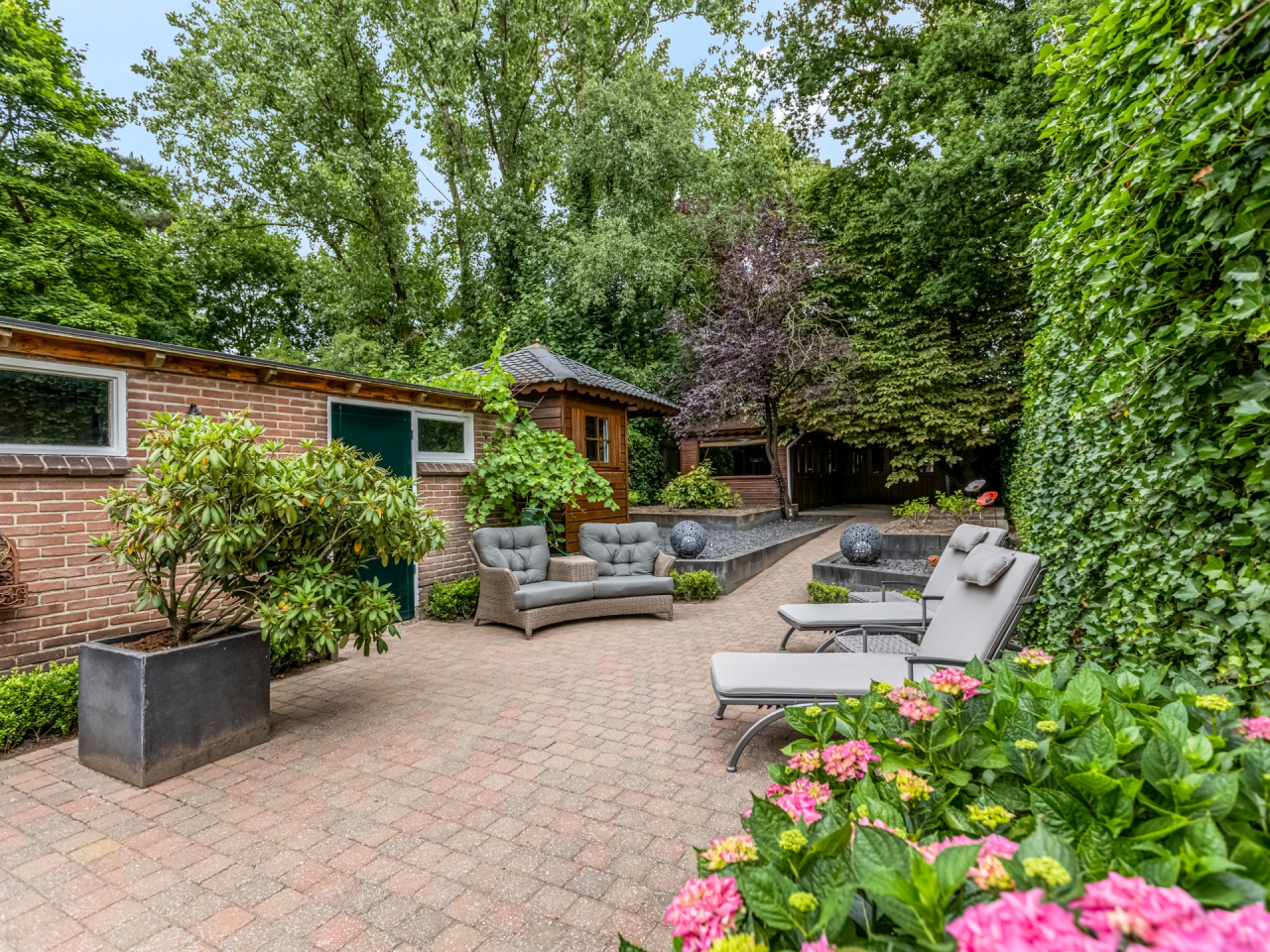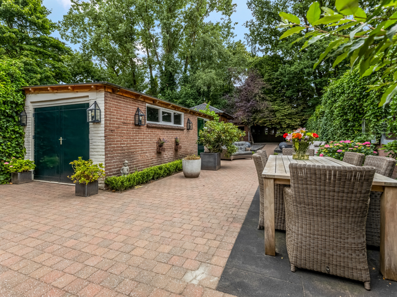 • Vrijstaande stenen garage, twee bergingen, houten tuinhuis en grote tuinkamer/veranda