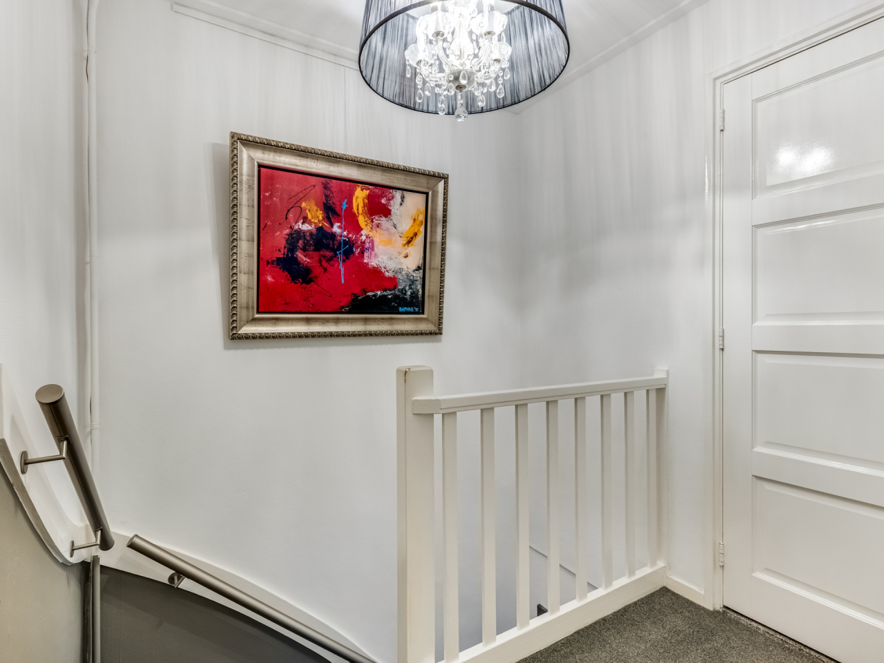 De overloop geeft toegang tot drie slaapkamers en de badkamer. Aan de voorzijde bevindt zich een slaapkamer van ca. 10 m², momenteel in gebruik als kantoor.