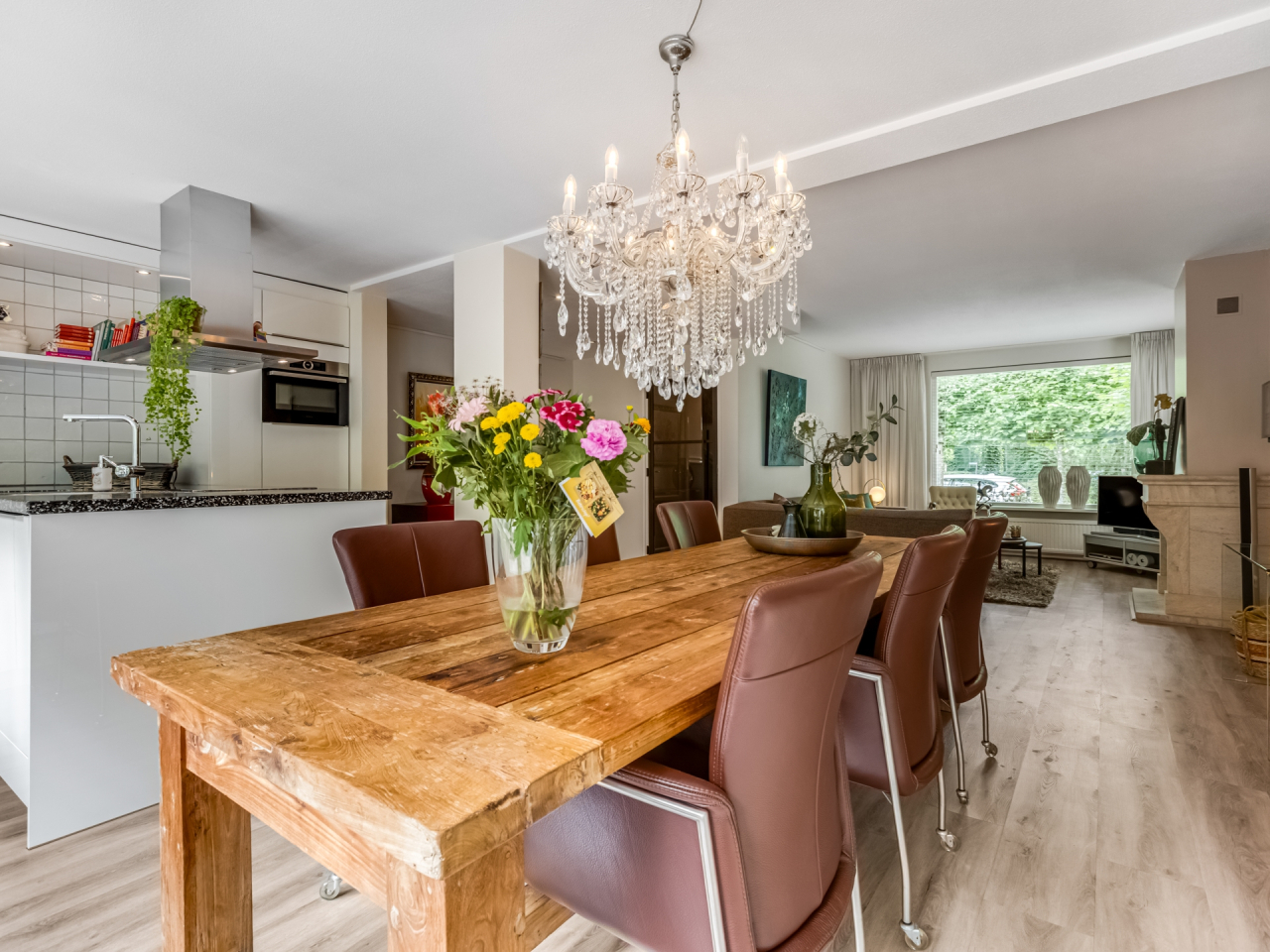 De uitgebouwde woonkamer is ruim en licht, voorzien van een gezellige gashaard en een laminaatvloer. Hier is volop ruimte voor een royale zithoek. De open keuken (2019), gelegen aan de achterzijde, is een droom voor kookliefhebbers: voorzien van een natuurstenen werkblad, spoelbak met luxe kraan, vijf zones inductiekookplaat, afzuigkap, combi-oven, koelkast, vaatwasser, ingebouwde koffiemachine en veel opbergruimte.